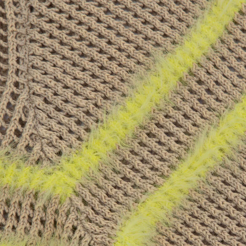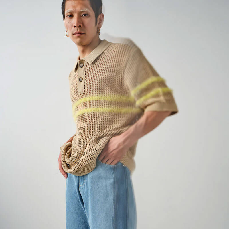 ACMH by Magic Castles Kember Polo – Ecru: A crochet knitted polo with button down ribbed collar and placket. Contrast fluffy yarn stripe and finished with an acid wash to create worn in look.