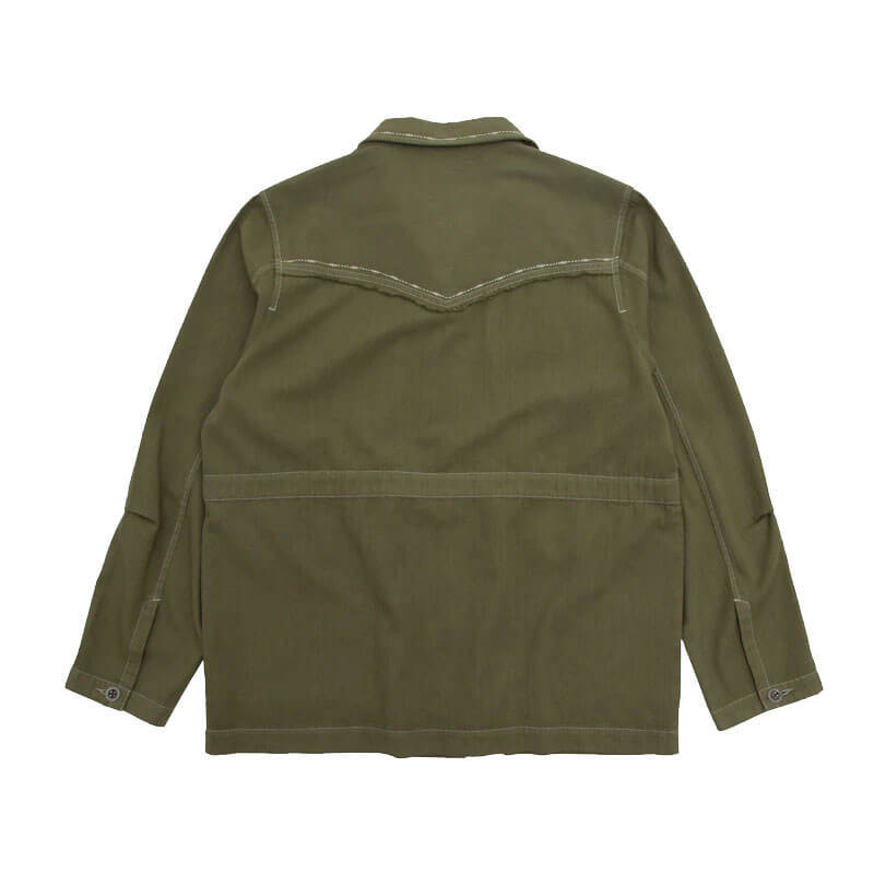 - Baggy angled chest patch pockets and large lower patch pockets with faux mother of pearl popper details
