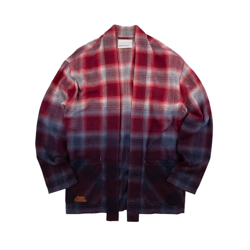 MAGIC CASTLES Wyatt Shawl Collar Shirt – Red Check: Loose, long sleeve check shirt with Magic Castles silk embroidery on front and back.