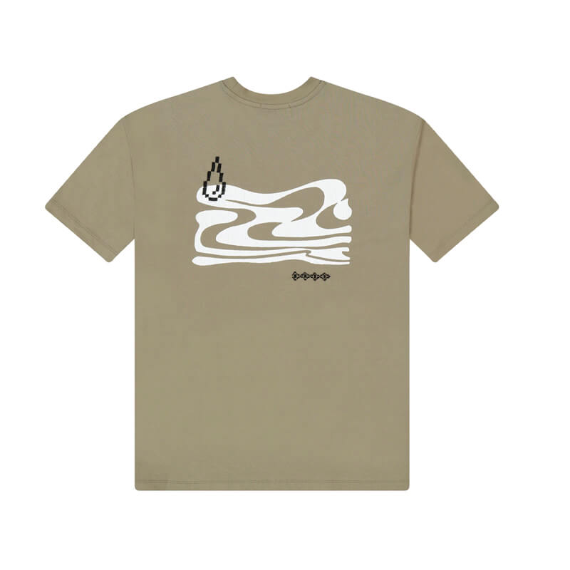 ADISH Amwaj Tee – Khaki: Cotton jersey short sleeve T-shirt with screen-printed logo on the chest and back and Palestinian hand embroidery detailing.