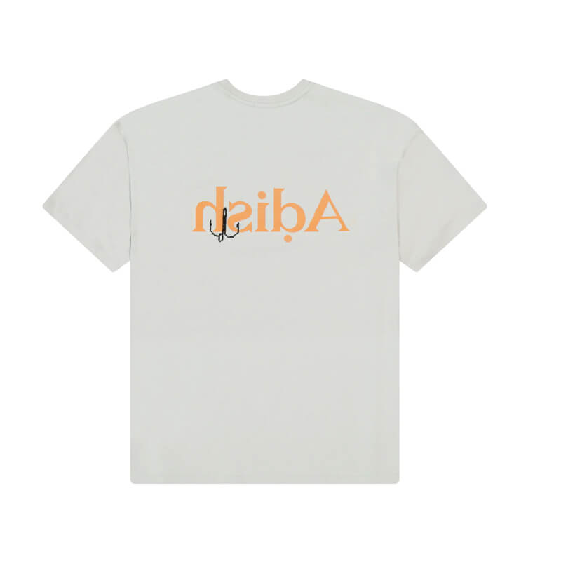 ADISH Mersa Logo Tee – White: Cotton jersey short sleeve T-shirt with screen-printed logo on the chest and back and Palestinian hand embroidery detailing.