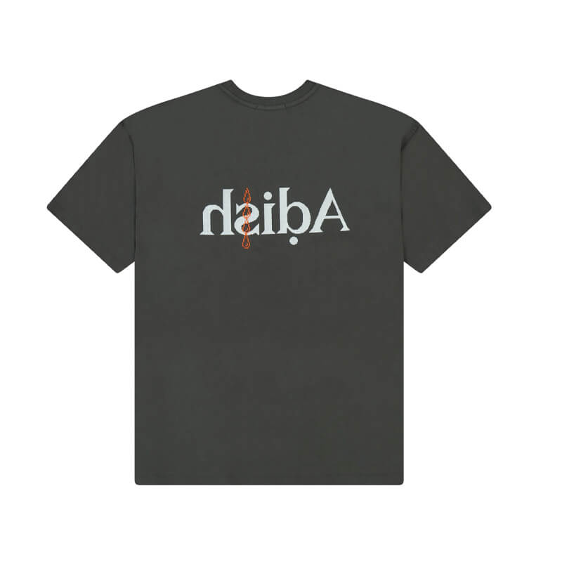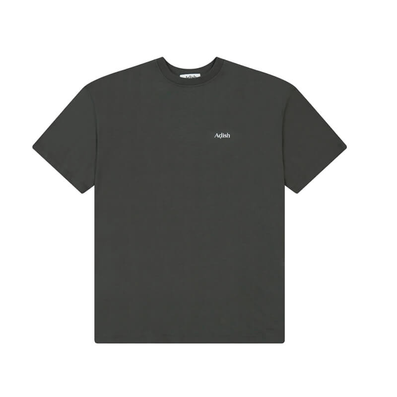 ADISH Qatarat Logo Tee – Dark Grey: Cotton jersey short sleeve T-shirt with screen-printed logo on the chest and back and Palestinian hand embroidery detailing.
