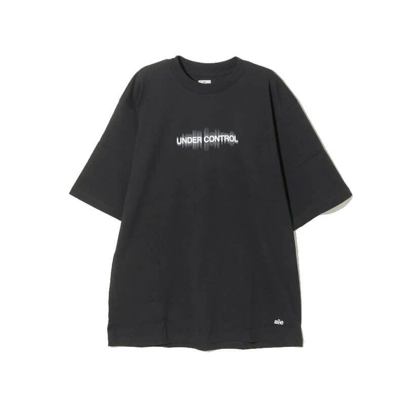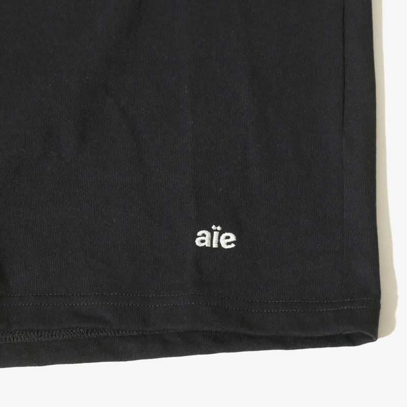 AÏE Mock Neck Tee – Black: Short sleeve tee with round and slightly mock neck. Featuring small embroidered logo on front and graphic printed on chest.