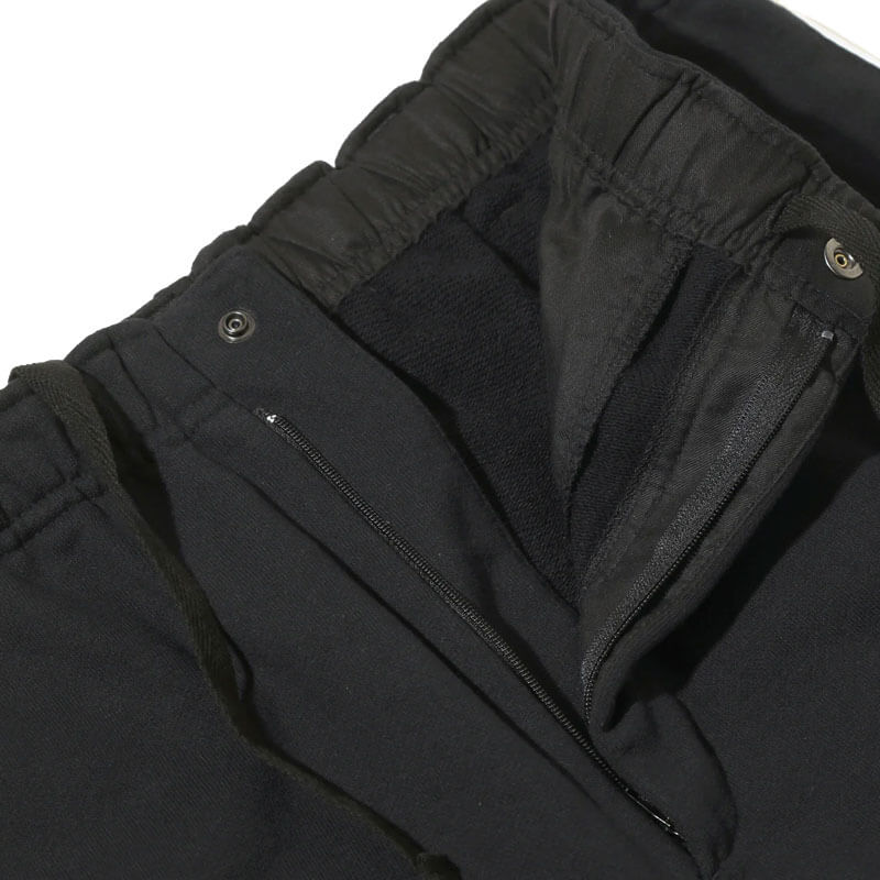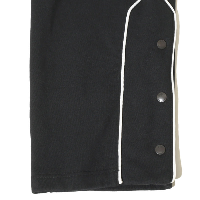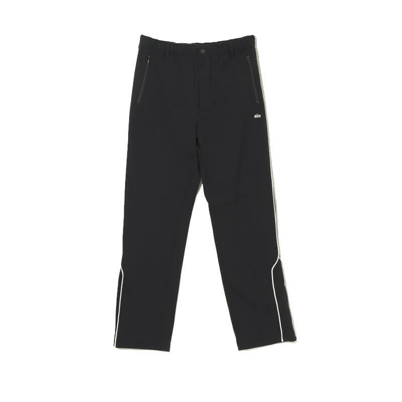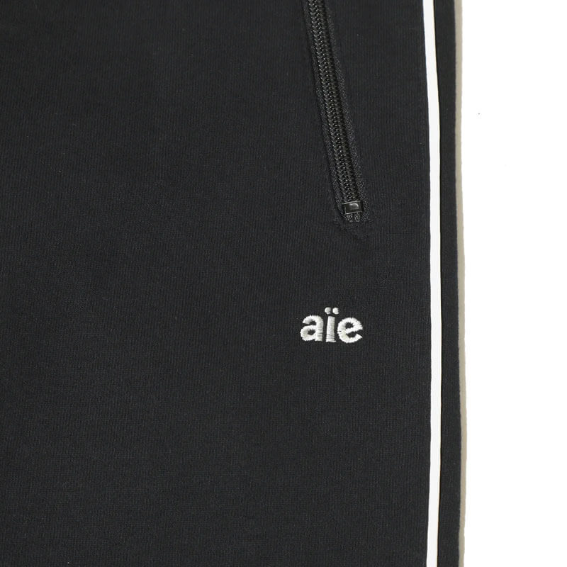 AÏE Pipping Sweat Pant – Black: Sweat pants are based on sporty pants, though operate with piping on the sides to create a unique look. All pockets are zipped pockets and the hems can be opened and closed with snap buttons. These sweatpants have a relaxed feel, but the contrasting piping decorations give them a tighter impression.