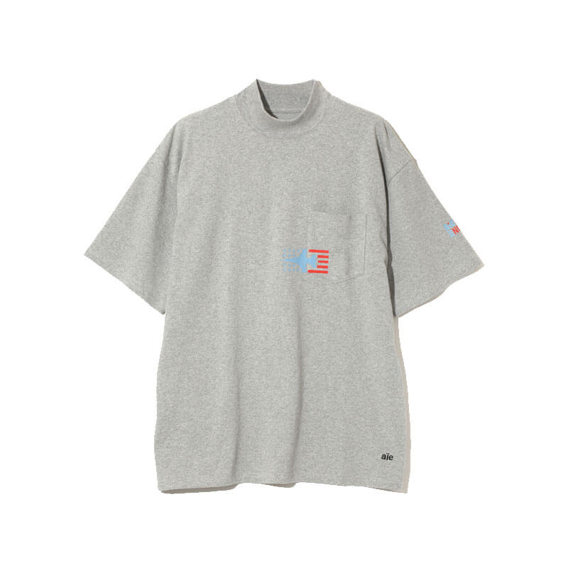 AÏE Printed Mock Neck Tee – Grey: Short sleeve tee with round and slightly mock neck. Featuring small embroidered logo on front and graphic printed on chest.