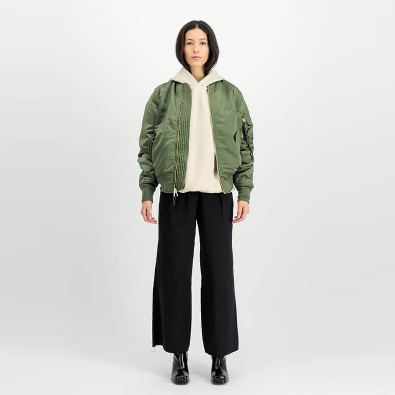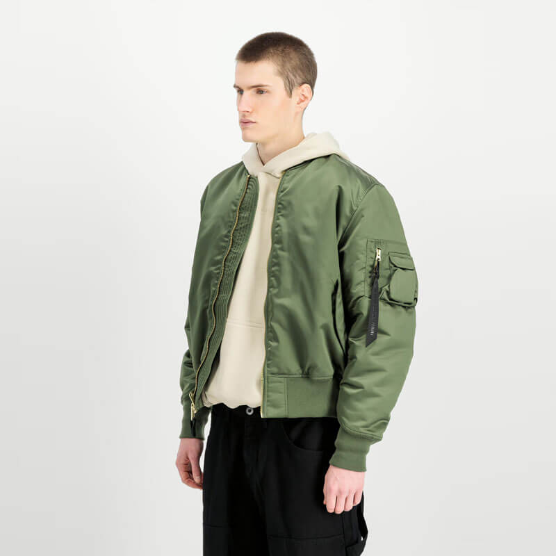 Delivered for Spring25 Ultra Violet collection, this ALPHA INDUSTRIES UV MA-1 Base Flight Bomber Jacket – Sage Green features: