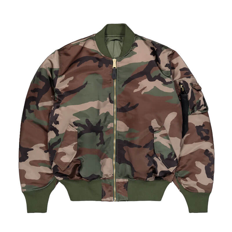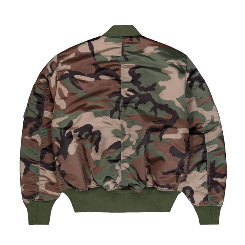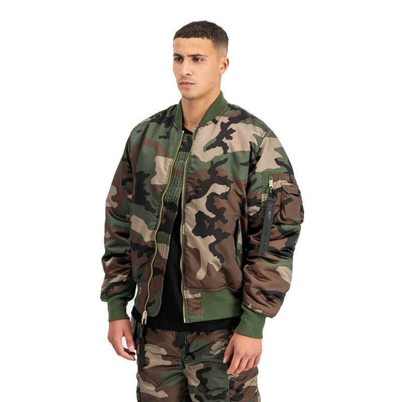Delivered for Spring25 Ultra Violet collection, this ALPHA INDUSTRIES UV MA-1 Primaloft Flight Camo Jacket – Woodland features: