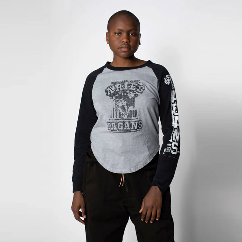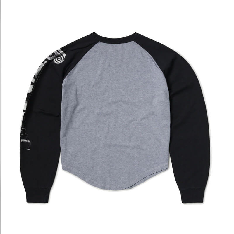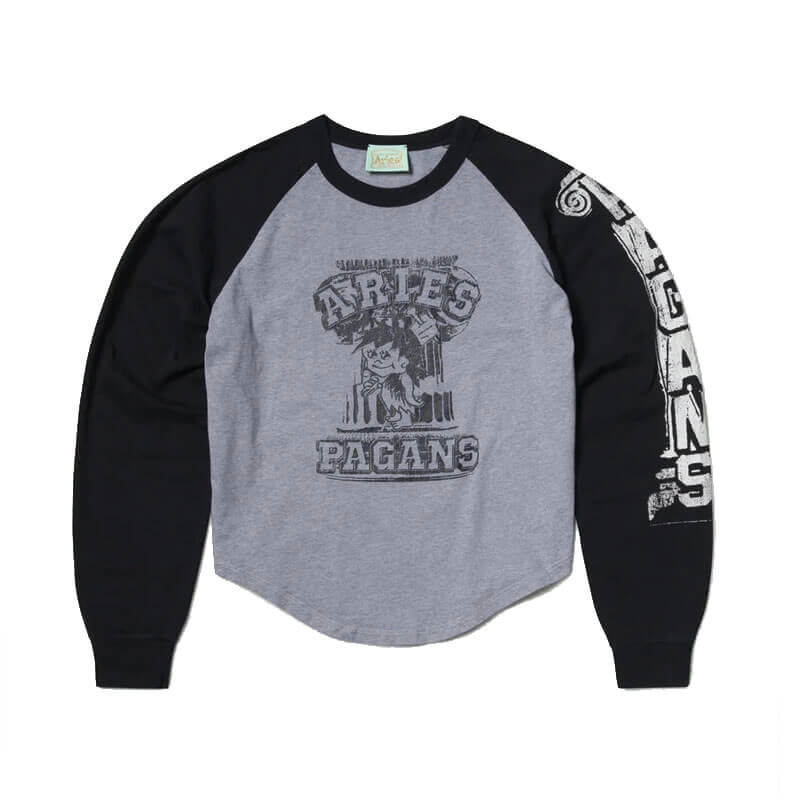 ARIES Aged Raglan Baseball LS Tee – Multi: Unisex long sleeve raglan t-shirt made from mid-weight cotton jersey, colour-blocked grey marl and black with seasonal graphics screen print on the front and sleeves. Finished with heavy stone wash treatment.