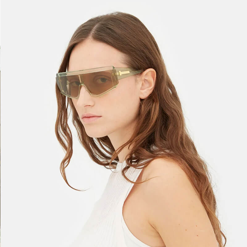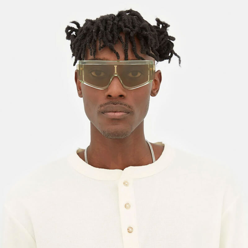 ARIES x RETROSUPERFUTURE Zed Sunglasses – Aqua: The Aries x RSF ZED is characterized by its unique shield lens and carefully crafted acetate body. The thick acetate construction features precise lines in contrast with smooth curves and thick temples. The highlight of the model is the lens cut, which extends over the acetate on the exterior sides, creating a unique angular detail on the temples.