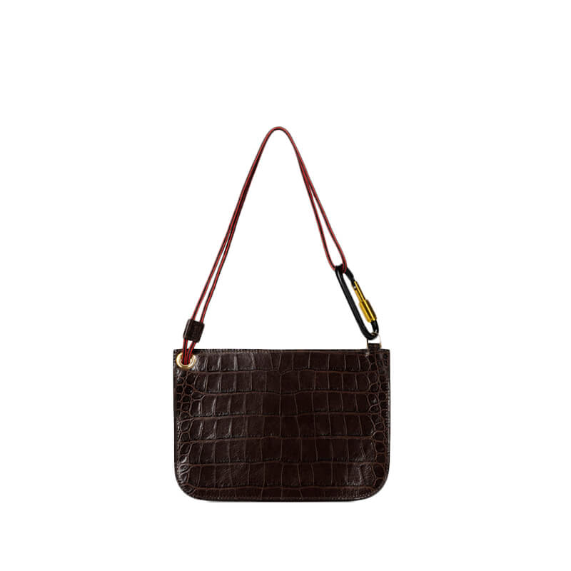 ARIES Bobby Leather Bag – Crocodile: Leather mini pouch bag with a gold-tone embossed Temple logo. Made from premium Italian cowhide in a mock-croc finish. With a detachable leather waist belt and climbing rope shoulder strap with Aries carabiner.