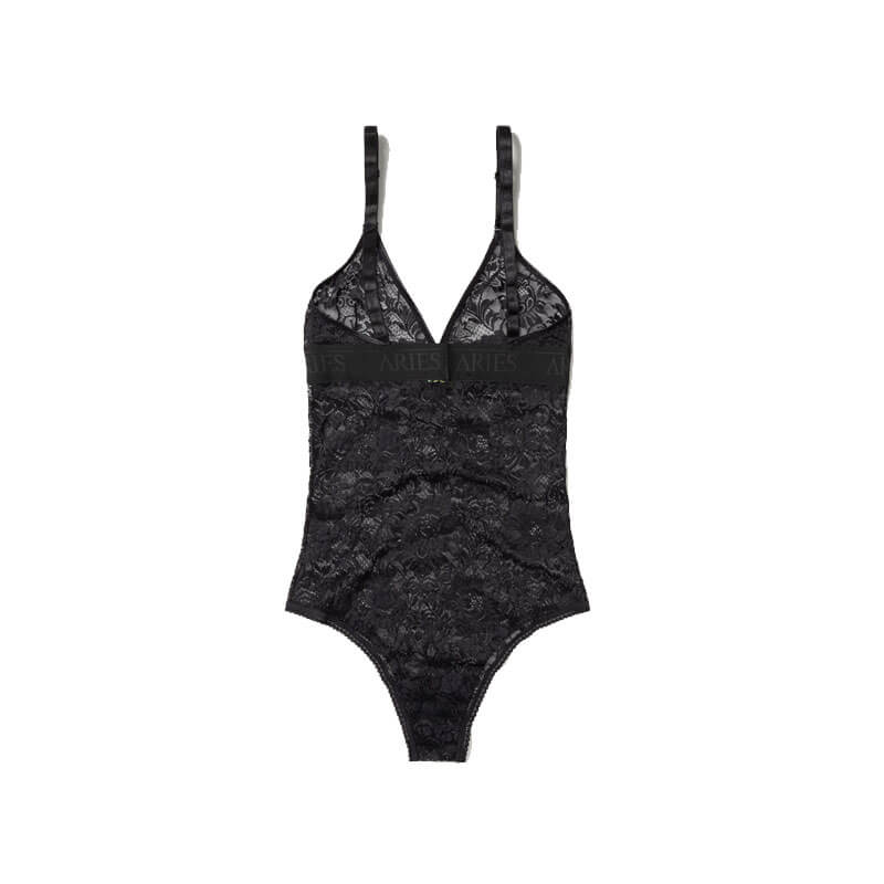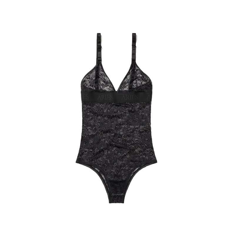 ARIES ARISE Fleur Lace Body – Black: Fitted bodysuit made from Aries’ custom fleur de lis stretch lace. With jacquard logo elastic band detailing, adjustable shoulder straps and snap fasteners at the crotch. This ARIES ARISE Fleur Lace Body – Black is included in the last FW23 delivery and features:
