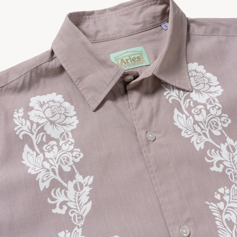 ARIES Lace Overprinted Poplin Shirt – Brown: Classic long-sleeved shirt in a stripe poplin cotton with Aries Lace graphic screen print.