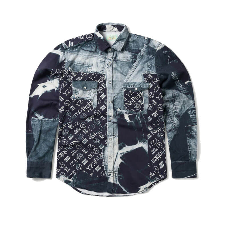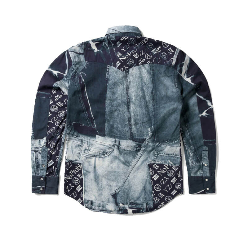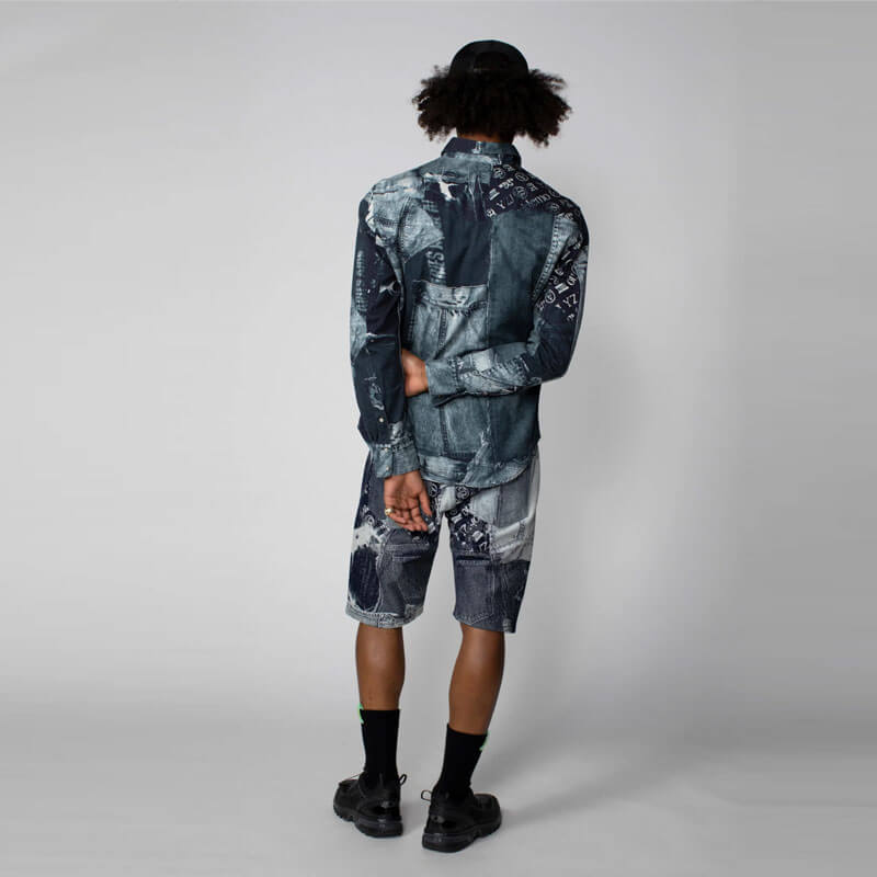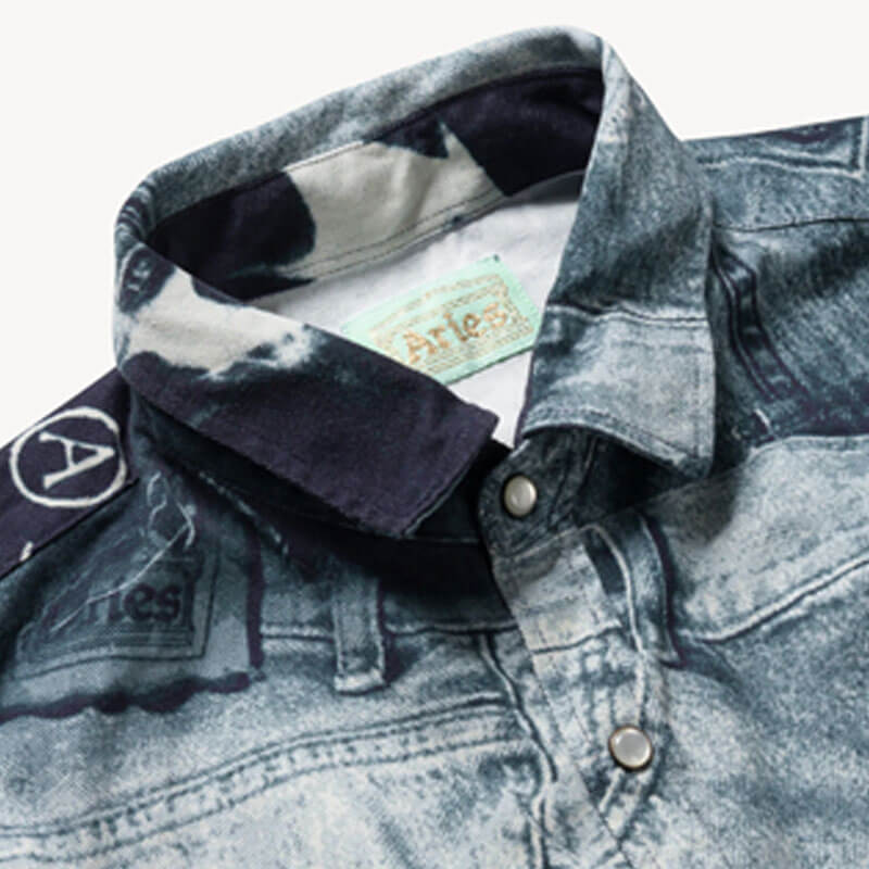 ARIES Patchwork Western Shirt – Blue: Unisex long sleeve Western shirt with flap pockets on chest, in cotton twill with an Aries Patchwork digital allover print.