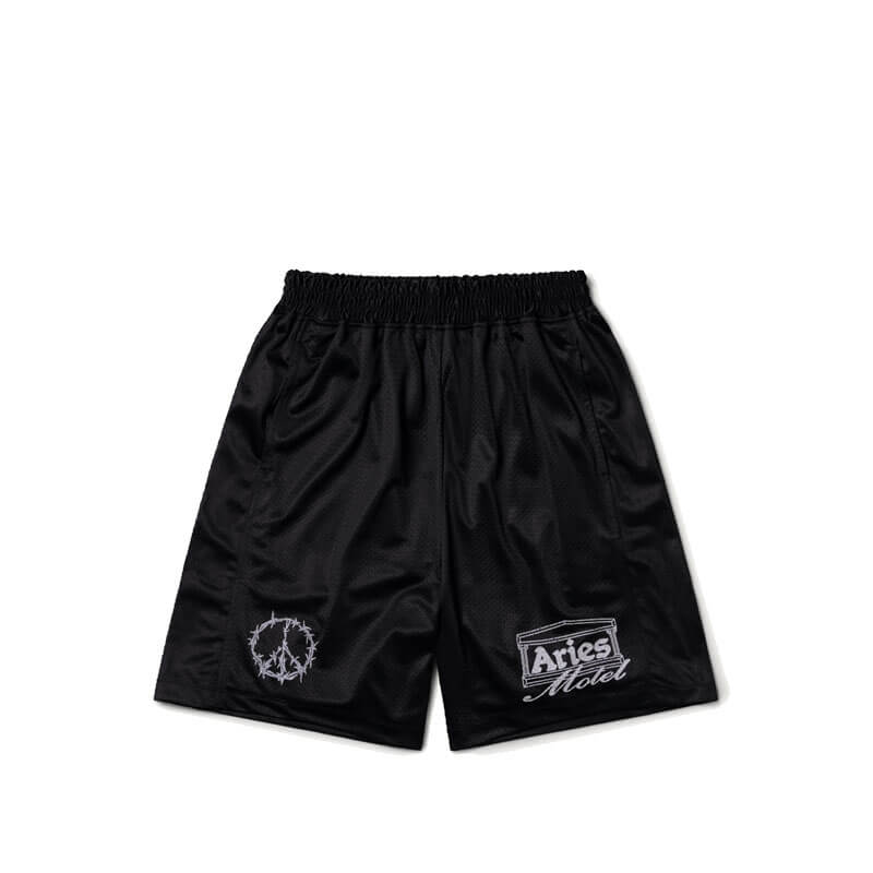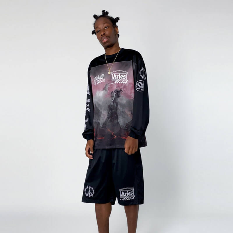 ARIES Ramscape Airtex Short – Black: Basketball shorts with Ramscape print on airtex mixed with black solid panels and graphic screen-prints on top.