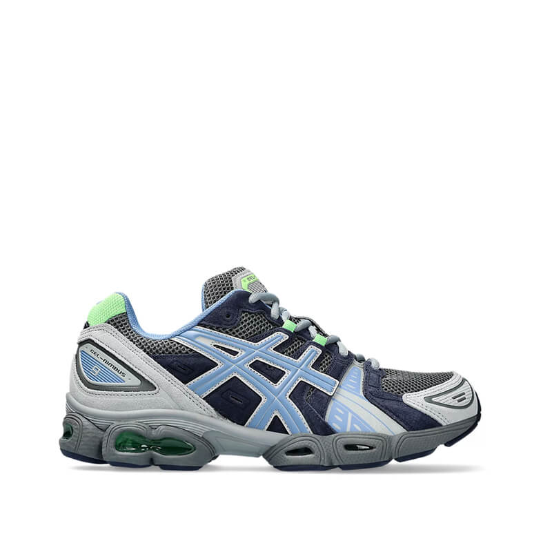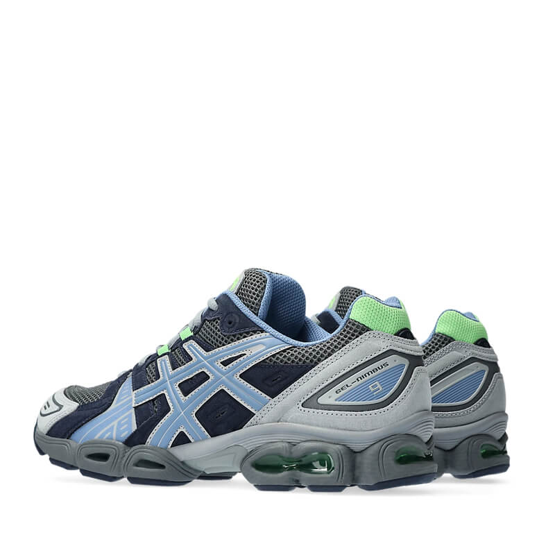 ASICS Gel-Nimbus 9 – Steel Grey / Blue Armony: The GEL-NIMBUS™ 9 sneaker was initially designed as a distance trainer for neutral and supinated runners. First released in 2007, this shoe resurfaces with original materials and key accent details. Its industrial look from the Y2K era is also offset with bold contrast and color blocking. In this era of Asics’ performance footwear, the brand shifted towards a more segmented midsole design. With GEL™ technology inserts in the heel and forefoot, this tooling helped create better cushioning and a more stable step.