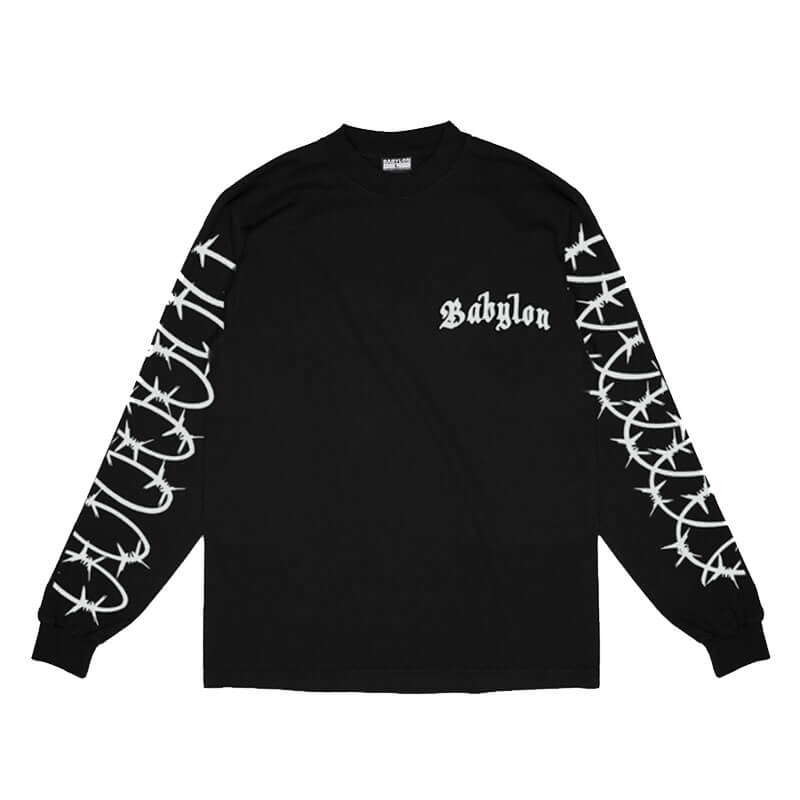 BABYLON LA Barber Longsleeve – Black: Slightly oversized long-sleeve tee crafted in midweight 6.5oz cotton jersey. Screen-printed graphics on front, back and sleeves complete the design.