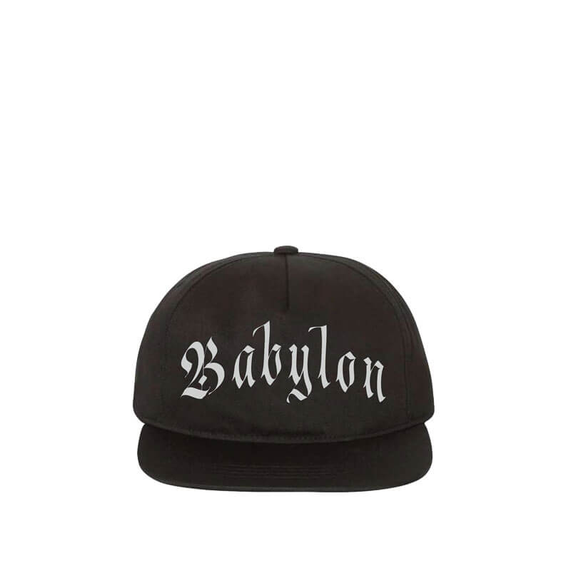 BABYLON LA Evil Logo Hat – Black: Unstructured 5-panel cap with screen-printed graphic on front and embroidered detail on back.