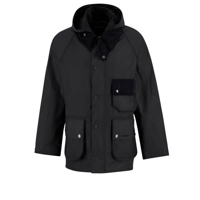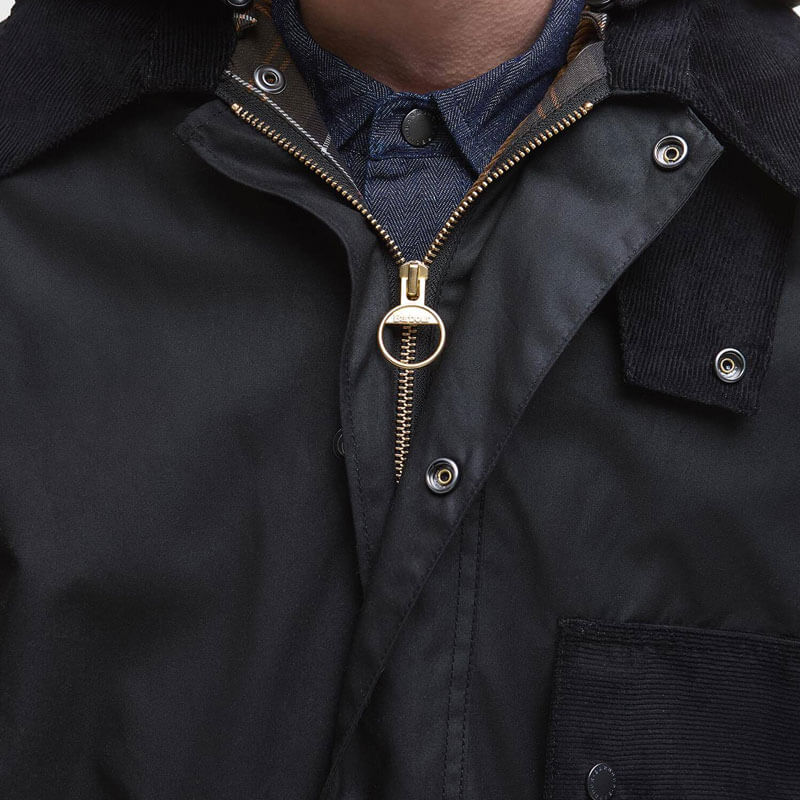 BARBOUR HERITAGE+ Modified Solway Wax Jacket – Black: The original Solway Waxed Jacket was first introduced to our range in 1960. This all round country jacket was designed with optimal practicality and functionality in mind, inspiring this season’s Modified Solway Waxed Jacket. Crafted from 6oz sylkoil waxed cotton, paired with our signature cord collar, detachable fabric hood and lower bellow pockets, this style is made for countryside adventures and city exploring alike.
