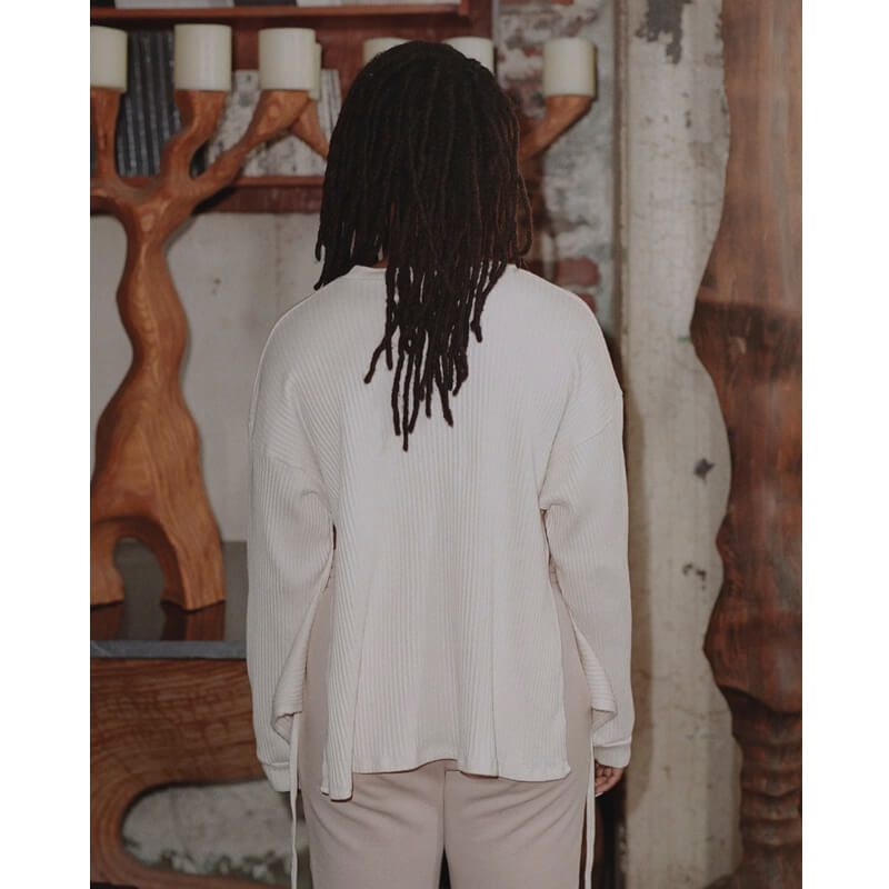 BASERANGE Shaw LS Tee – Off White: Ribbed cotton jersey long sleeve wrap top crafted in organic cotton. This Baserange wrap top features multiple ways of fastening.