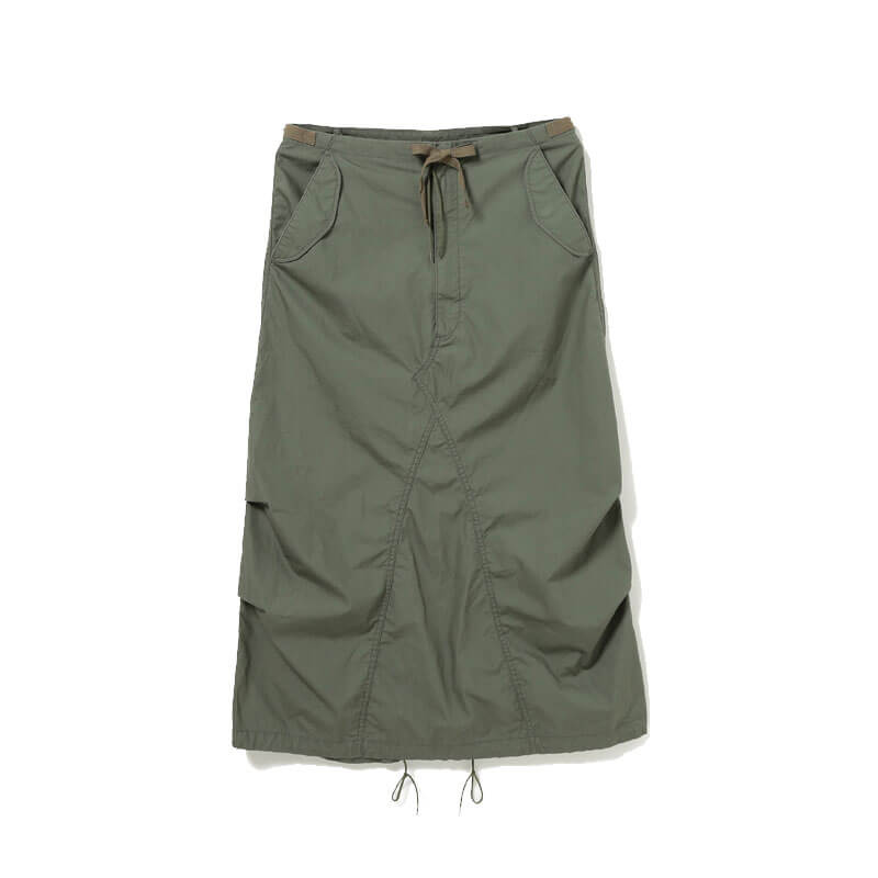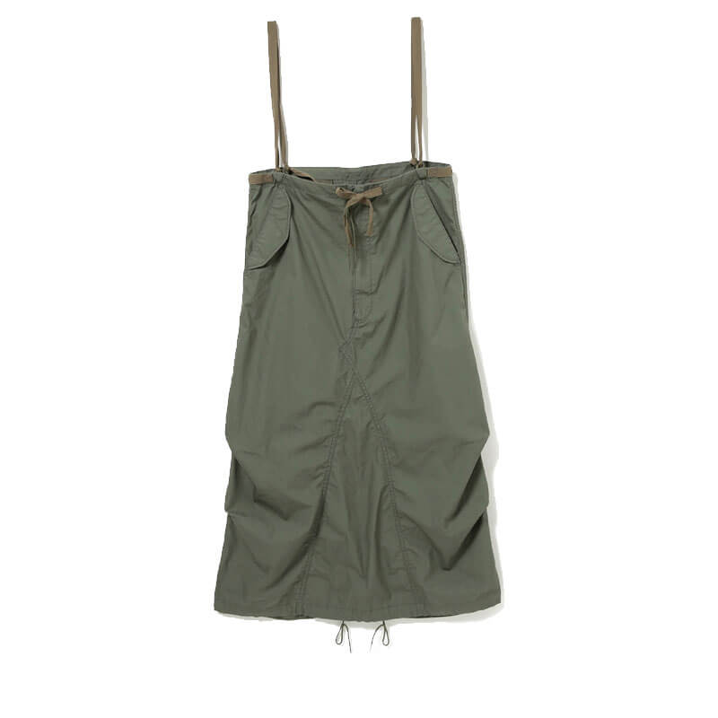 BEAMS BOY Army Convertible Overall Skirt – Olive: This high waist convertible skirt reimagines traditional military design with a modern, functional aesthetic. The sub-label of the Japanese streetwear icon Beams, emerged in the late ’90s as a brand for women that sought out the durability, function and tailoring of mens sportswear and military influenced styles. Crafted from a durable cotton blend, this piece converts from skirt to dress through detachable overall straps and a drawstring hemline to allow versatile styling options. A button-and-zip closure with an adjustable drawstring waistband provides a customisable fit while snap button pockets at the sides and back enhances the garment’s blend of vintage utility and contemporary style.