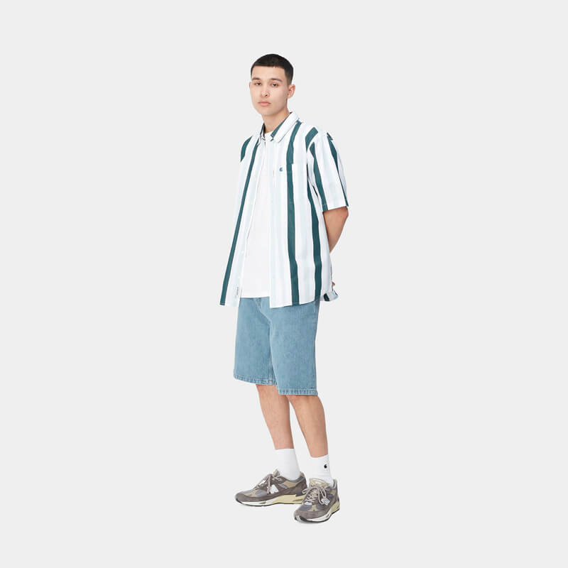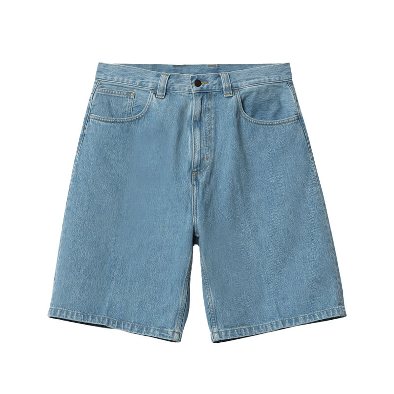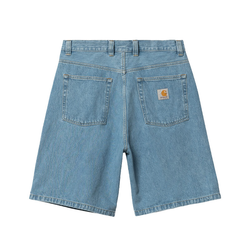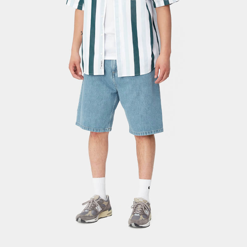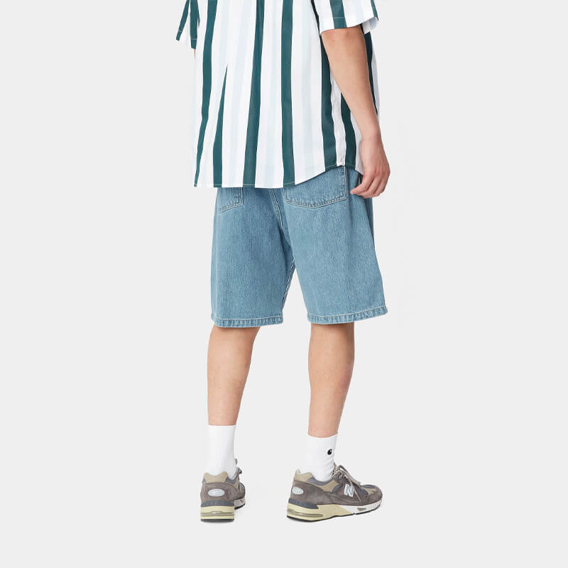 CARHARTT WIP Brandon Short – Blue Stone Bleached: Short pant cut in a loose straight fit with a low crotch from Smith denim, which is a heavyweight cotton fabric. The five-pocket style comes in several iterations ranging from a stone-washed version, offering a subtly worn-in finish, to a stone-bleached version, which is lighter in appearance. A back yoke and a woven Square Label complete the design.