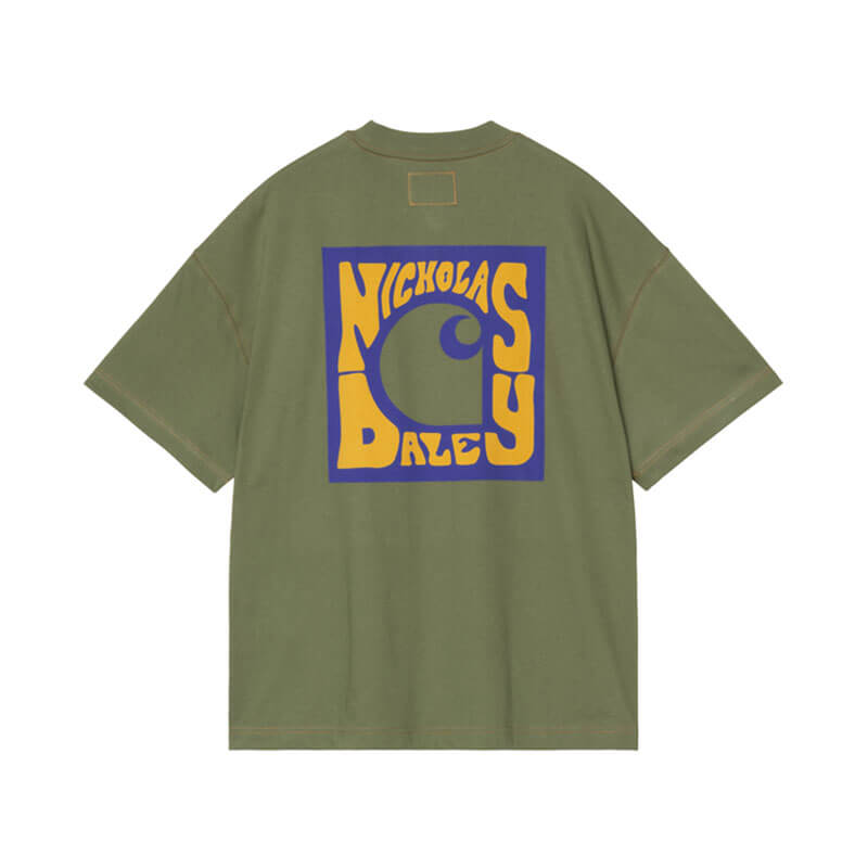 CARHARTT WIP x NICHOLAS DALEY Logo T-Shirt – Cypress: For Fall/Winter 2025, Carhartt WIP has collaborated with designer Nicholas Daley to create a collection focused on Daley’s core values of community, craftsmanship and culture, while nodding to his own Jamaican and Scottish heritage. The Carhartt WIP x Nicholas Daley Logo T-Shirt is made in a boxy loose fit from midweight cotton jersey. A large graphic print appears at the back, inspired by 70s typography. The item is also detailed with contrast stitching throughout. A co-branded Square Label appears on the chest pocket.