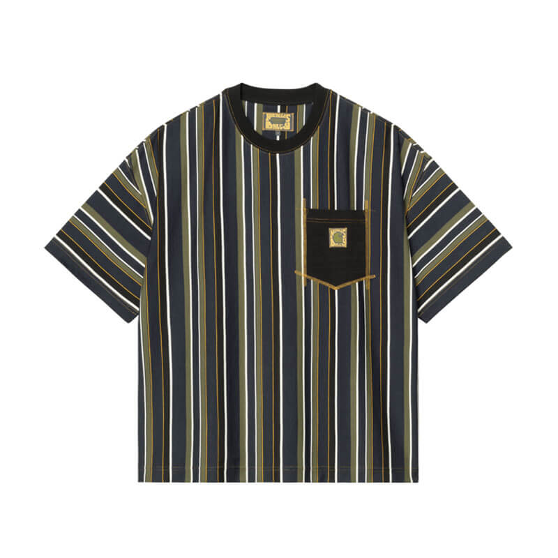 CARHARTT WIP x NICHOLAS DALEY Stripes T-Shirt – Blue: For Fall/Winter 2025, Carhartt WIP has collaborated with designer Nicholas Daley to create a collection focused on Daley’s core values of community, craftsmanship and culture, while nodding to his own Jamaican and Scottish heritage. The Carhartt WIP x Nicholas Daley Poster T-Shirt is made in a boxy loose fit from midweight cotton jersey. A large graphic print appears at the back, inspired by Daley’s parents’ ‘Reggae Klub’ nights in the late 70s. The item is also detailed with contrast stitching throughout. A co-branded Square Label appears on the chest.