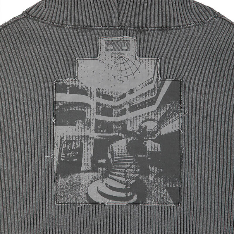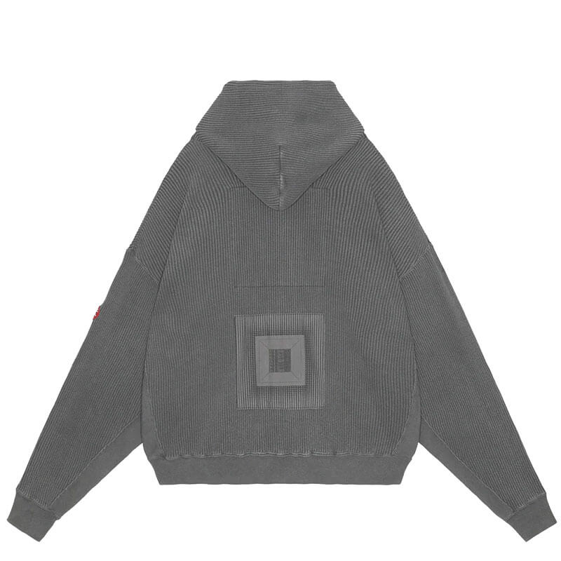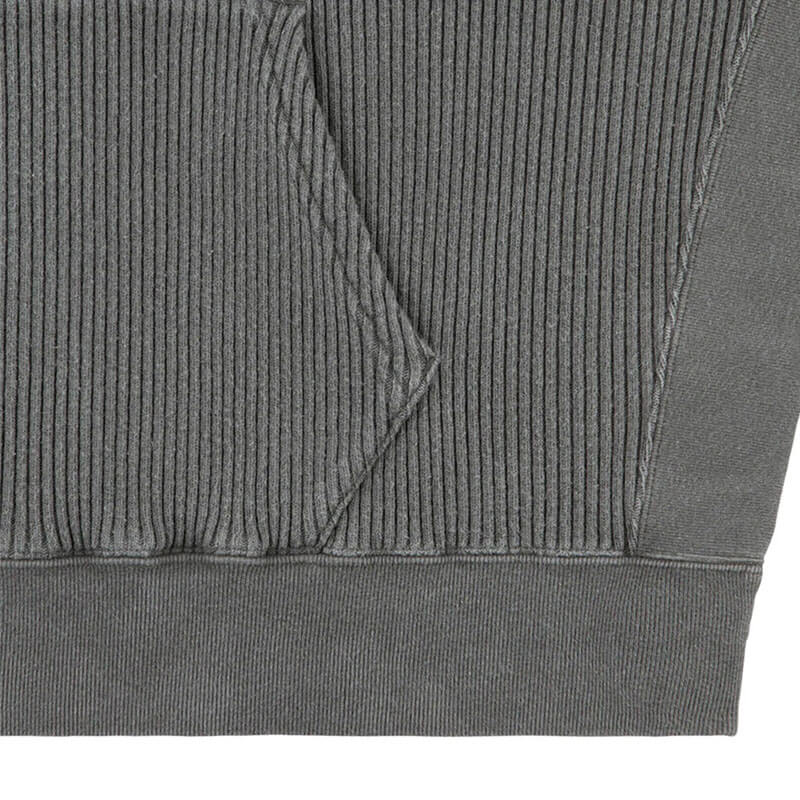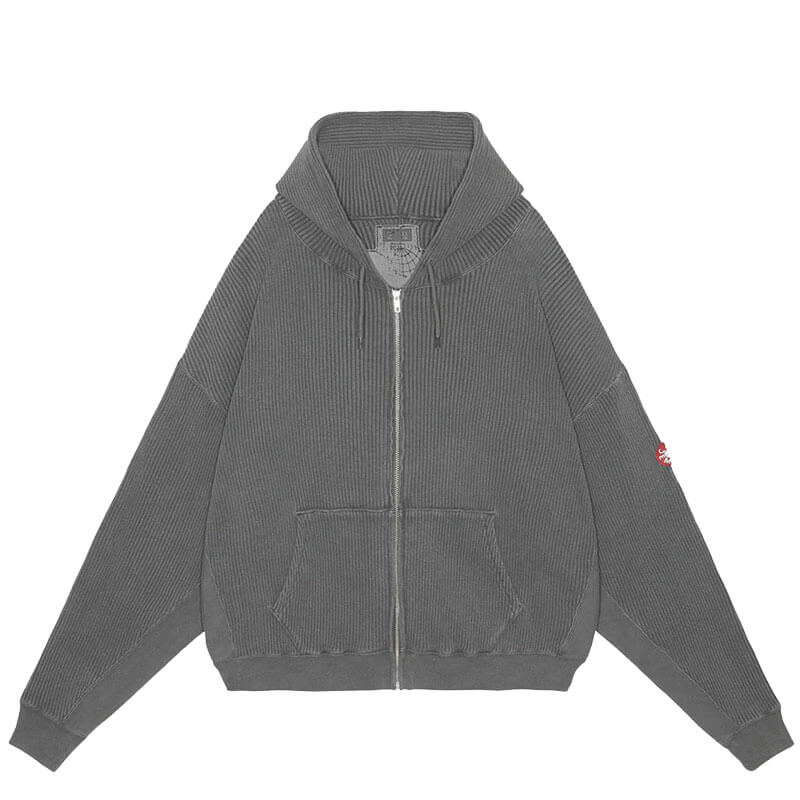CAV EMPT Overdye Wide Rib Cut Zip Hoodie – Charcoal: Full zippered hooded sweatshirt crafted in cotton jersey with wide rib. Pre-washed to avoid shrink with a bio process, this garment is finished with graphic design patch on back.