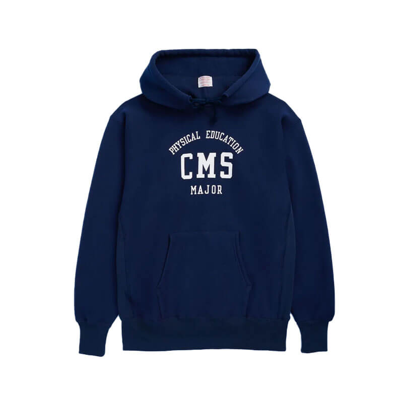 CHAMPION TRUE TO ARCHIVES After Hoodie – Dark Navy: This pullover hoodie is a revival of the “Reverse Weave®” model, which received its second patent in 1952. Known as the “after hooded sweatshirt,” it features a hood integrated into the ribbed neck area. The design includes details such as all edges sewn in and the specific stitching placement inside the hood, faithfully replicating the original 1950s features. The collar label accurately reflects the patent numbers for “Reverse Weave®” and “Expansion gusset.” The print design is based on authentic vintage products, and the left sleeve remains without the C logo patch, consistent with the original specifications.