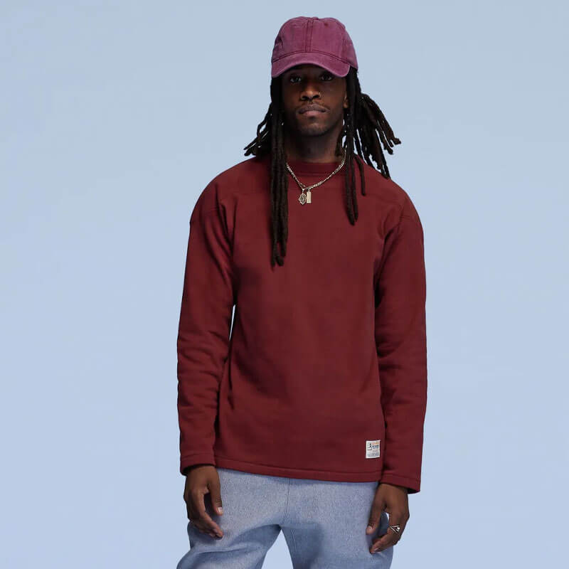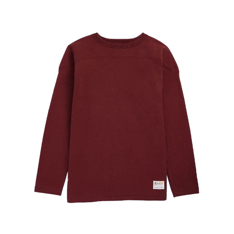 CHAMPION TRUE TO ARCHIVES LS Football Tee – Maroon: This practice football T-shirt is a reproduction of the American football practice uniform used in the 1960s, which used 100% cotton fabric.It features a thick fabric and double-layered shoulder and elbow for reinforcements. The “RUNNINGMAN” jock tag attached to the left hem also faithfully reproduces the design of the 1950s.No C logo patch on the left sleeve is the same as the original specification.