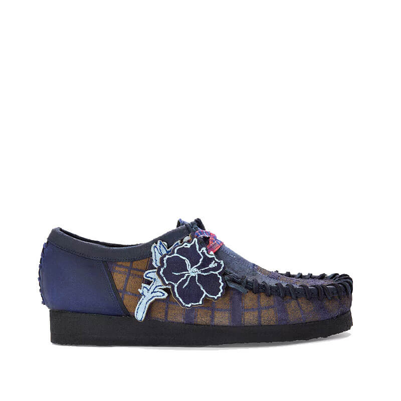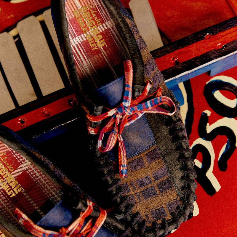 CLARKS ORIGINALS x NICHOLAS DALEY Wallabee – Navy Combi: This collaboration Wallabe is a bold reinterpretation of an icon, infused with personal heritage and bold detail. Crafted from a rich mix of smooth suede, waxed leather, and hairy tartan-patterned suede, the upper pays homage to Daley’s Jamaican-Scottish roots. Madras-inspired laces and sock lining nod to Jamaica’s vibrant textile tradition, while co-branded fobs shaped like a Scottish thistle and Caribbean hibiscus complete the shoe.