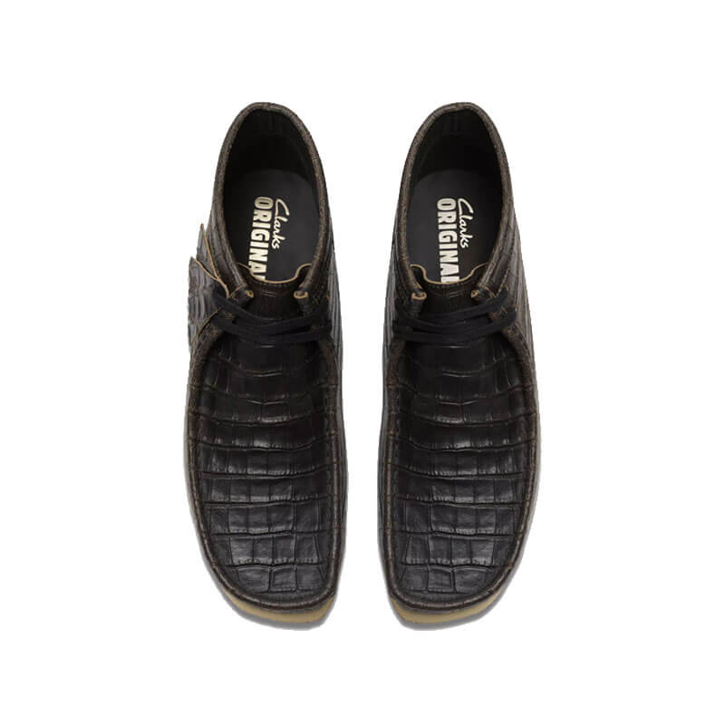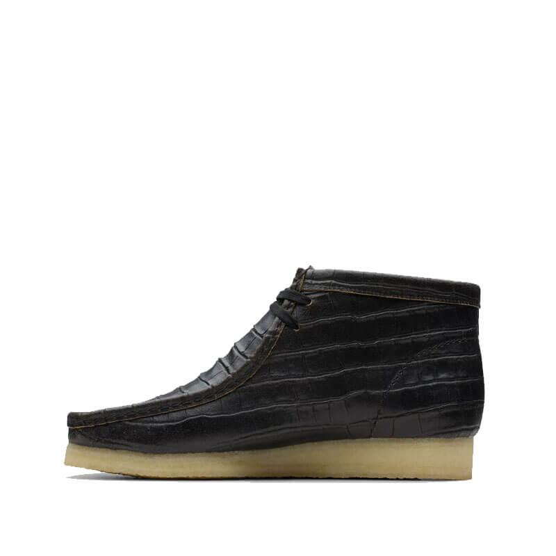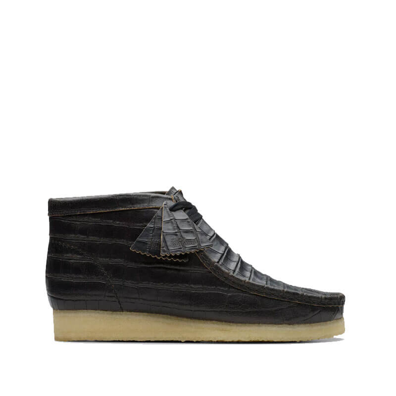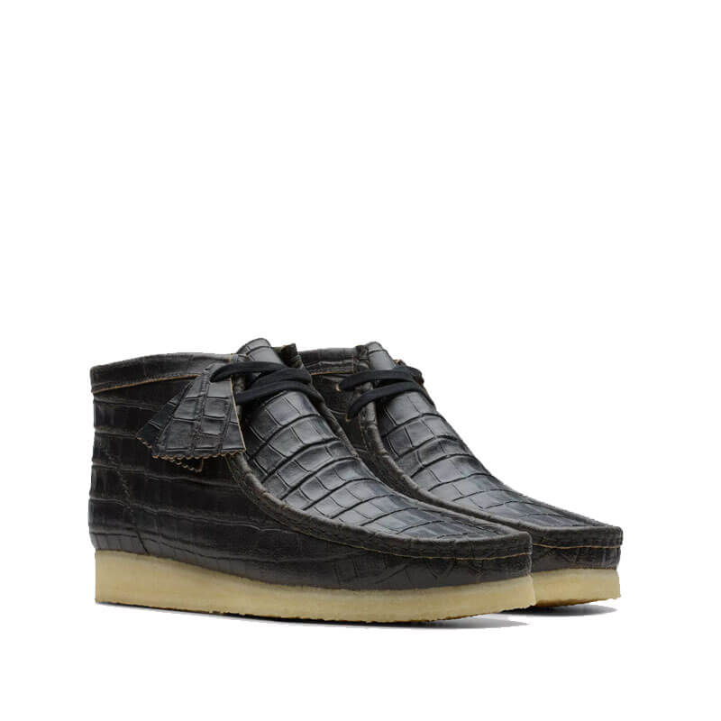 CLARKS ORIGINALS Wallabee Boots – Crocodile Black: The classic Wallabee Boot arrives with a bold croc-embossed design that’s inspired by Tokyo’s Urahara fashion scene. Featuring distressed leather that’s typical of the movement’s rugged, experimental aesthetic, it pays tribute to the underground style revolution that paved the way for modern street culture. It comes together with flat lacing and tonal fobs that prove it’s all in the details – while Clarks’ iconic crepe sole stays true to its Originals DNA.