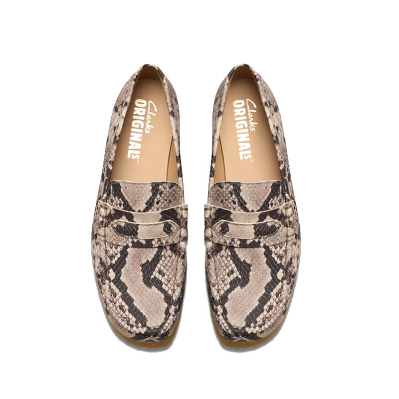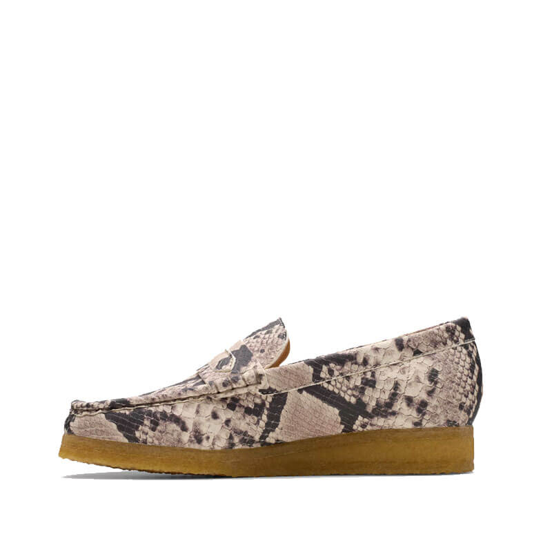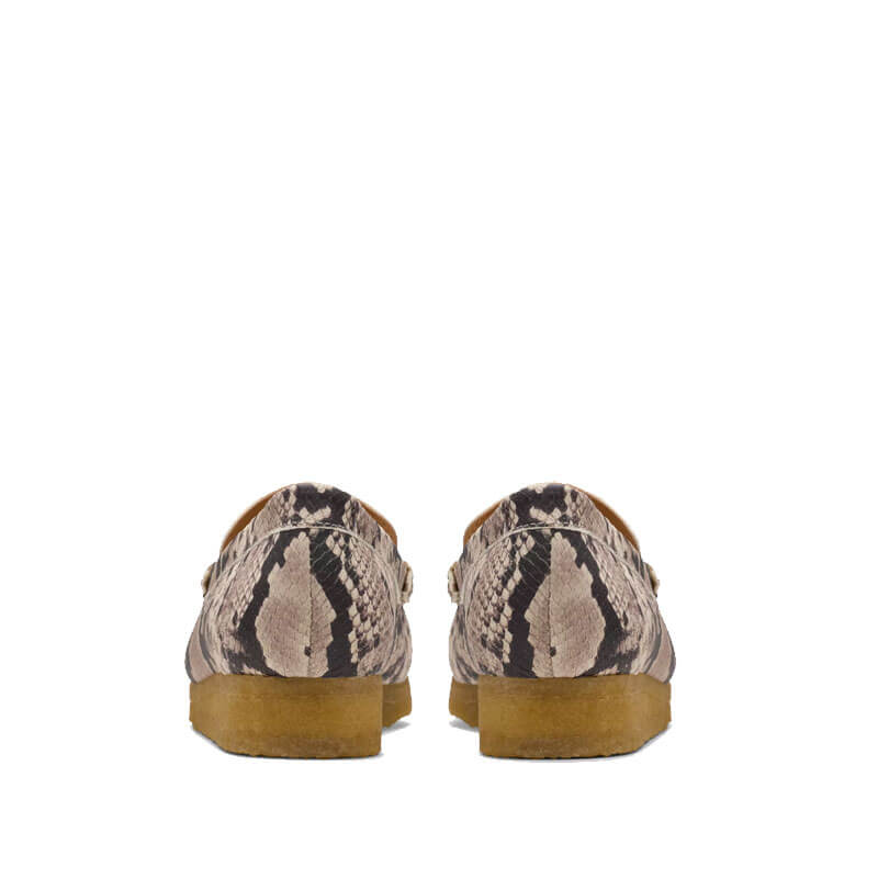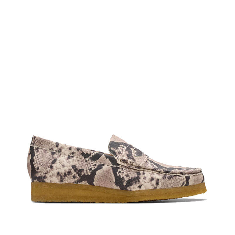 CLARKS ORIGINALS Wallabee Loafer – Grey Snake: The Clarks’ archival Wallabee Loafer makes an ultra-classic addition to your smart-casual footwear collection. Crafted from bold snake-effect leather in a cool grey colourway, this silhouette sits atop a chunky amber sole to nod to timeless design, while hand-stitched apron seams enhance its crafted look and feel.