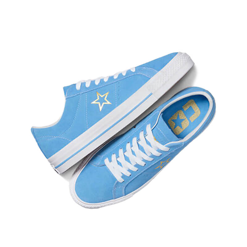CONVERSE One Star Pro Suede – Light Blue / White / Gold: These classic low-tops are suede and skate-ready.