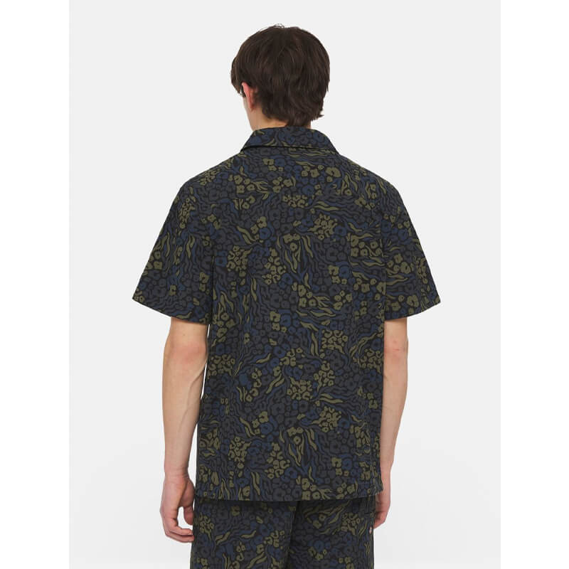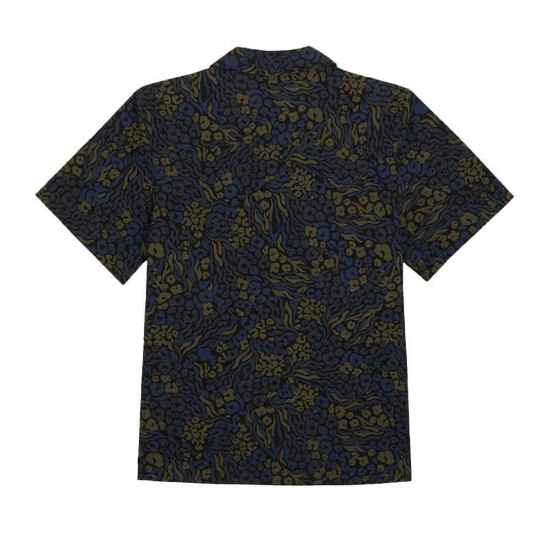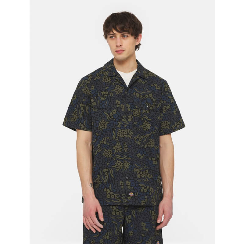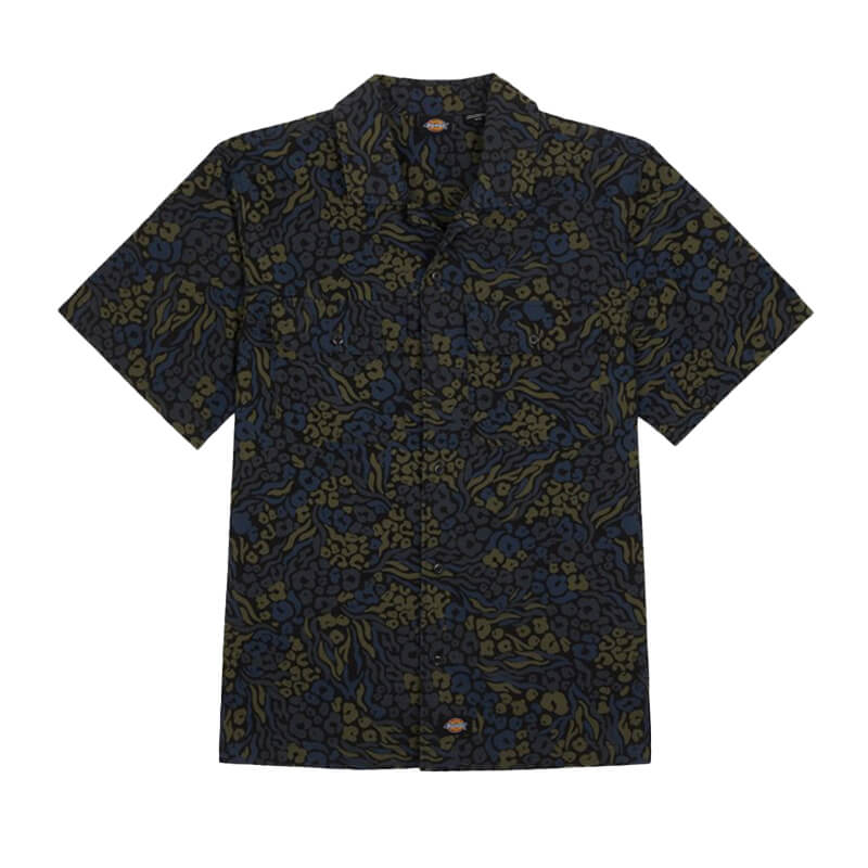 DICKIES Saltville Shirt – Blue / Brown: This classic short sleeve shirt features a bold all-over design that blurs the lines between a timeless giraffe and leopard print. An expressive design with style and durability in mind, this men’s retro shirt features two front pockets, an authentic v-shaped revere collar and a woven Dickies label.