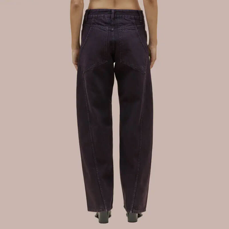 ECKHAUS LATTA Bend Jean – Amethyst: Mid-rise pant in 14oz black cotton denim, garment dyed a vibrant purple and stonewashed for a worn-in finish. Designed with a bowed leg, twisted side seams, and signature EL back pockets.