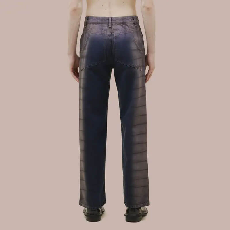 ECKHAUS LATTA Wide Leg Jean – Wrinkle: 14oz cotton indigo denim, crafted in U.S.A. Overdyed blue and bleached using the Shibori technique to reveal textured gray side seams and waistband. Finished with signature EL back pockets.