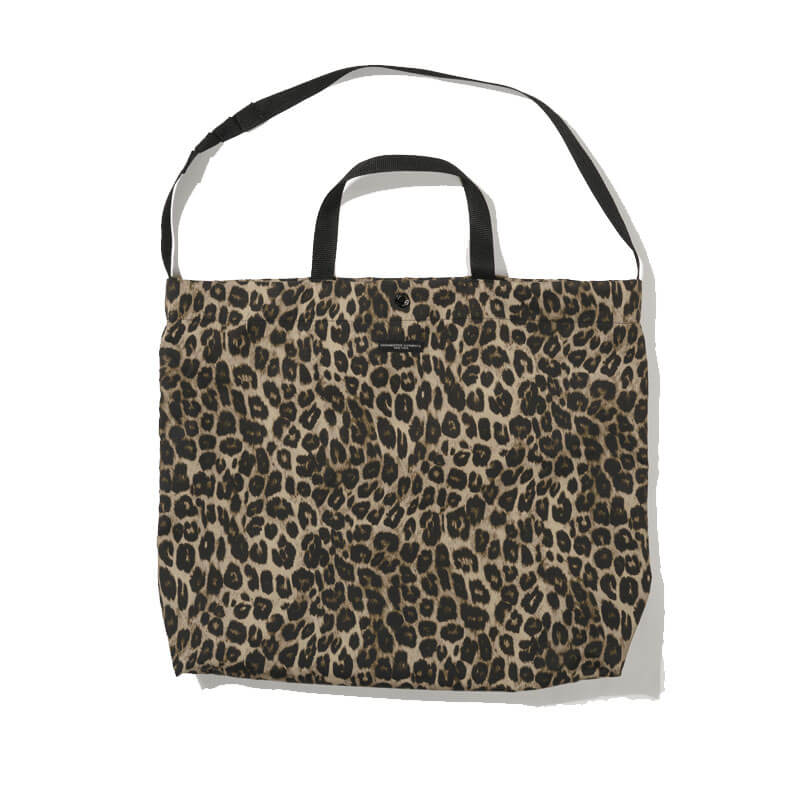 ENGINEERED GARMENTS Carry All Tote – Brown Leopard: A popular medium-sized bag made from unique nylon leopard fabric from Engineered Garments. Features dual carrying straps and branded snap button closure. The shoulder strap is sewn into a bellows shape, allowing it to be adjusted to the desired length by cutting the sewn thread.