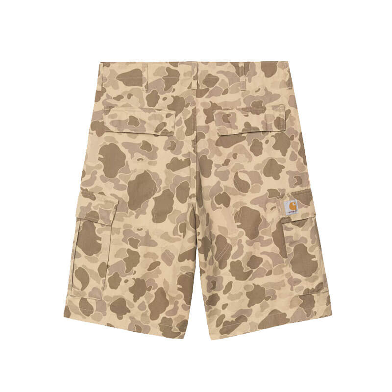 CARHARTT WIP Regular Cargo Short – Ripstop Camo Duck: The Regular Cargo Short is made from midweight cotton ripstop featuring an allover camouflage motif. The item has a regular fit with a low waist. Pockets appear on the front, sides, and back. A woven Square Label completes the design.