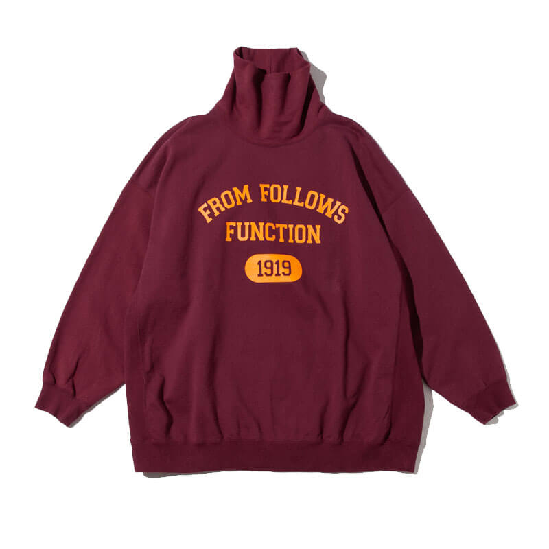 F/CE. College High Neck Sweat – Wine: This thick and strong reverse weave oversized, drop shoulder, high neck sweatshirt is made of recycled yarn. The front of the sweatshirt is printed with ‘FORM FOLLOWS FUNCTION’ in a classic collegiate style. Included in the Japanese brand F/CE’s FW22 collection, the Side Tape Velour Trousers features: