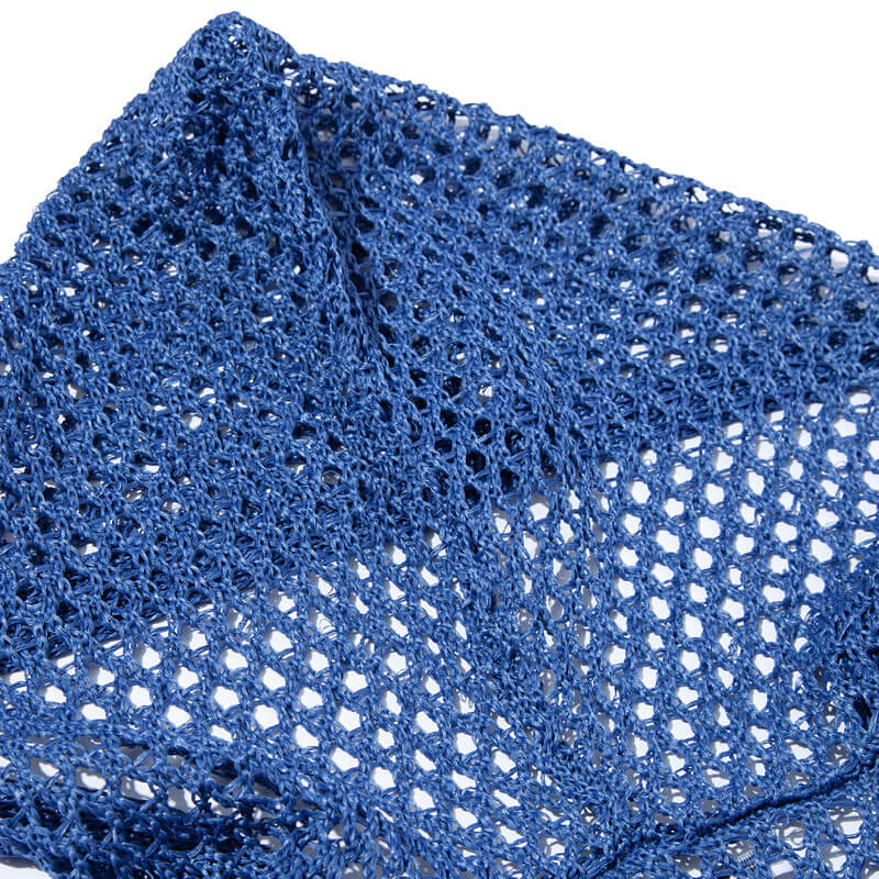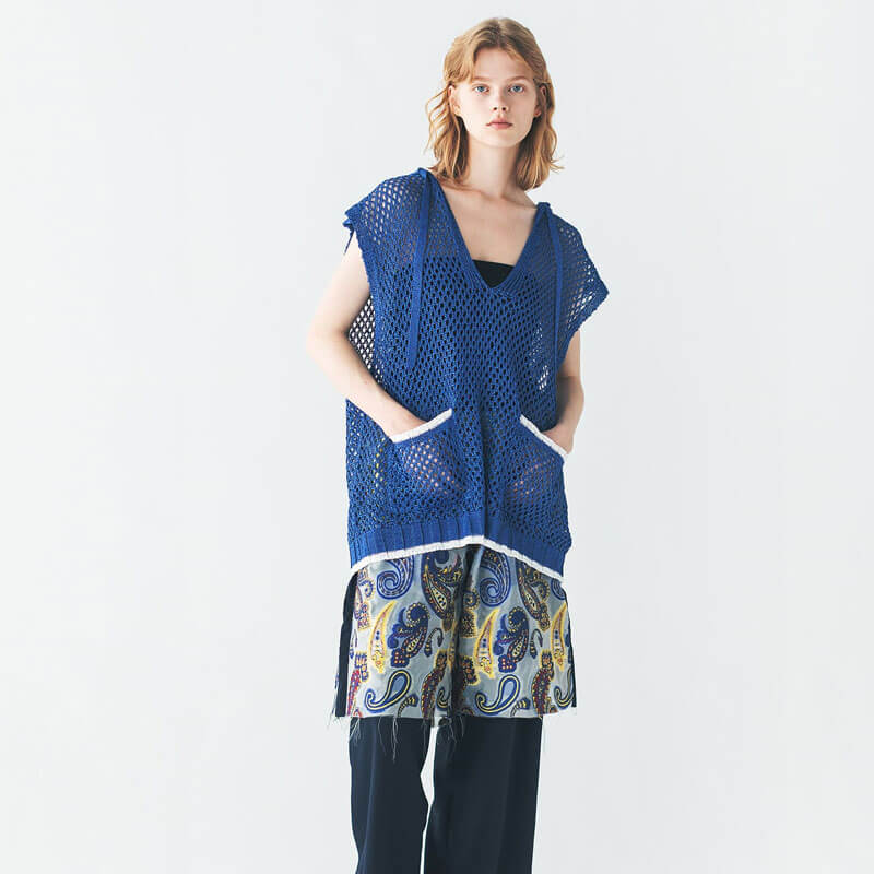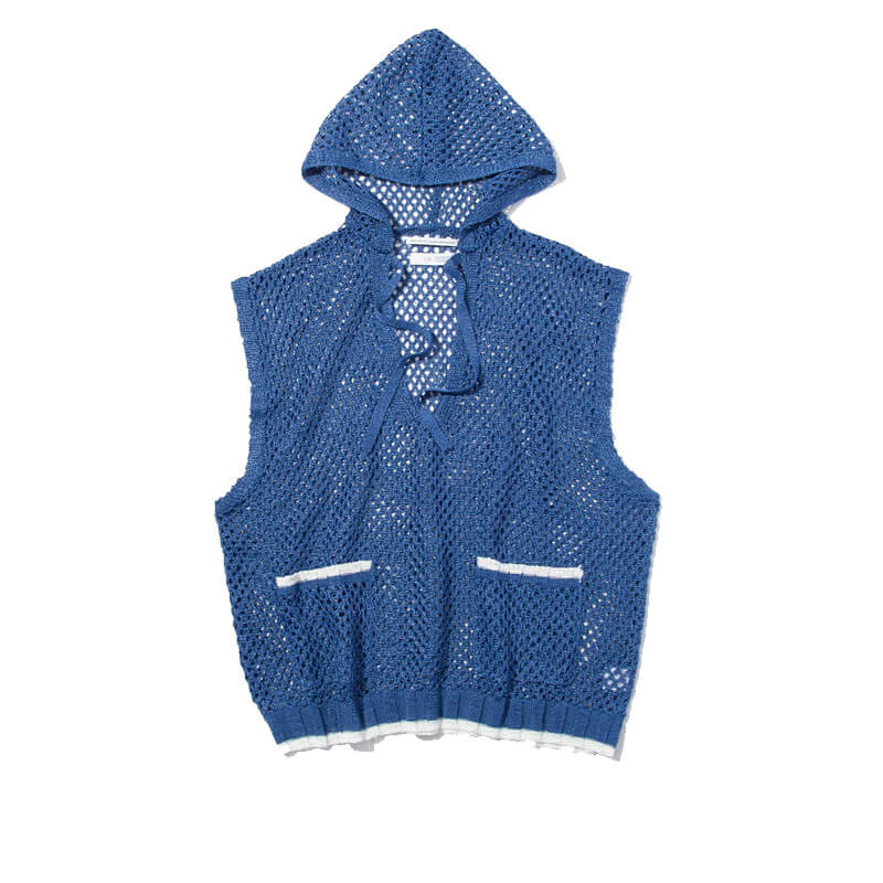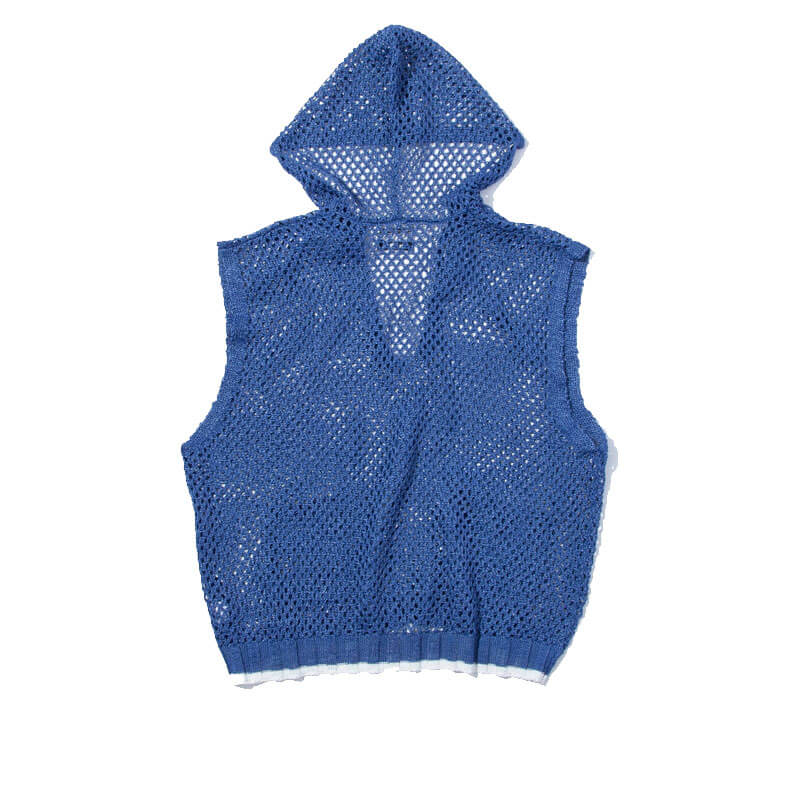 F/CE. Mesh Knit Vest – Blue: Hooded waistcoat knit in a rough, crisp and shiny polyester yarn, with a mesh-like finishing. The mesh-knit design allows you to show off your innerwear and enjoy layering.