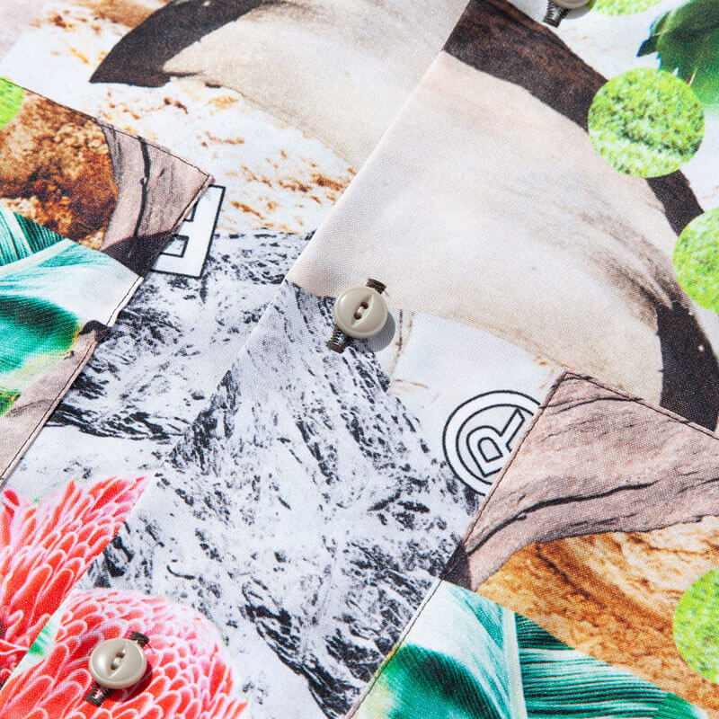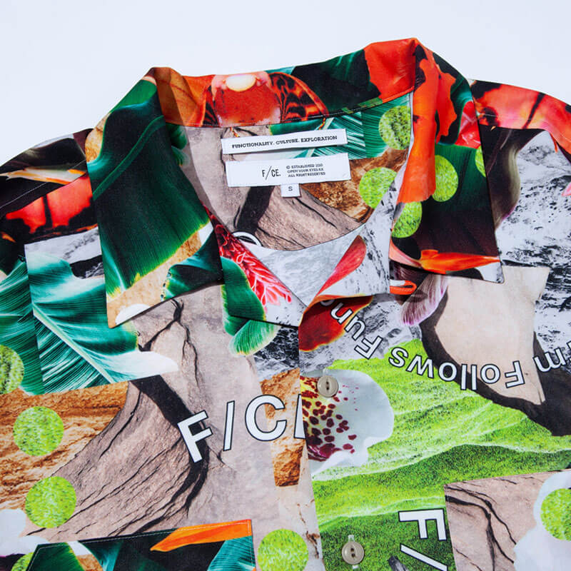 F/CE. Modern Botanical Recycle Shirt – Multi: Modernist, open collar shirt, printed with a contemporary botanical collage graphic. Cut from a 100% recycled polyester fabric, the original graphic design was commissioned by F/CE. to Mr Eda, designer of the apparel brand BAL. Looking for captures the brand attitude and feelings towards sustainability, this F/CE. Modern Botanical Recycle Shirt – Multi part of Spring-Summer23 collection and equipped with: