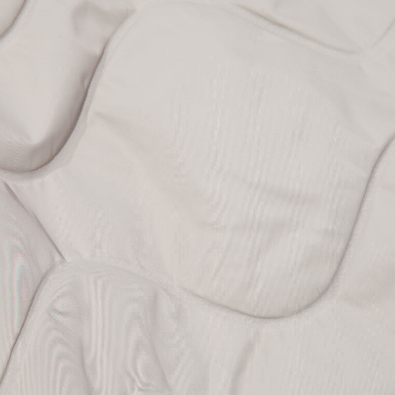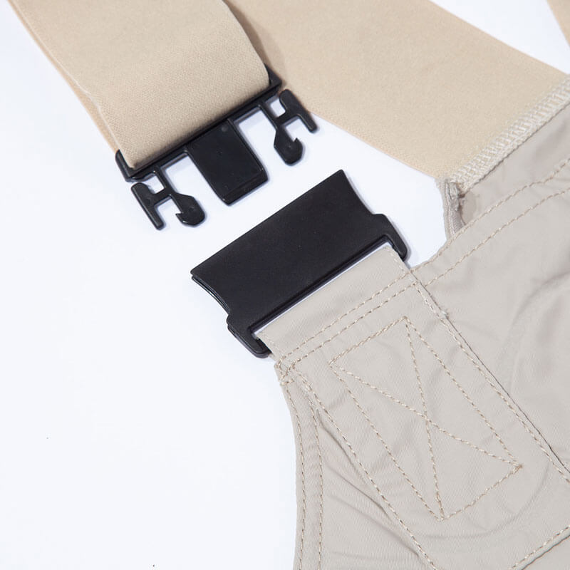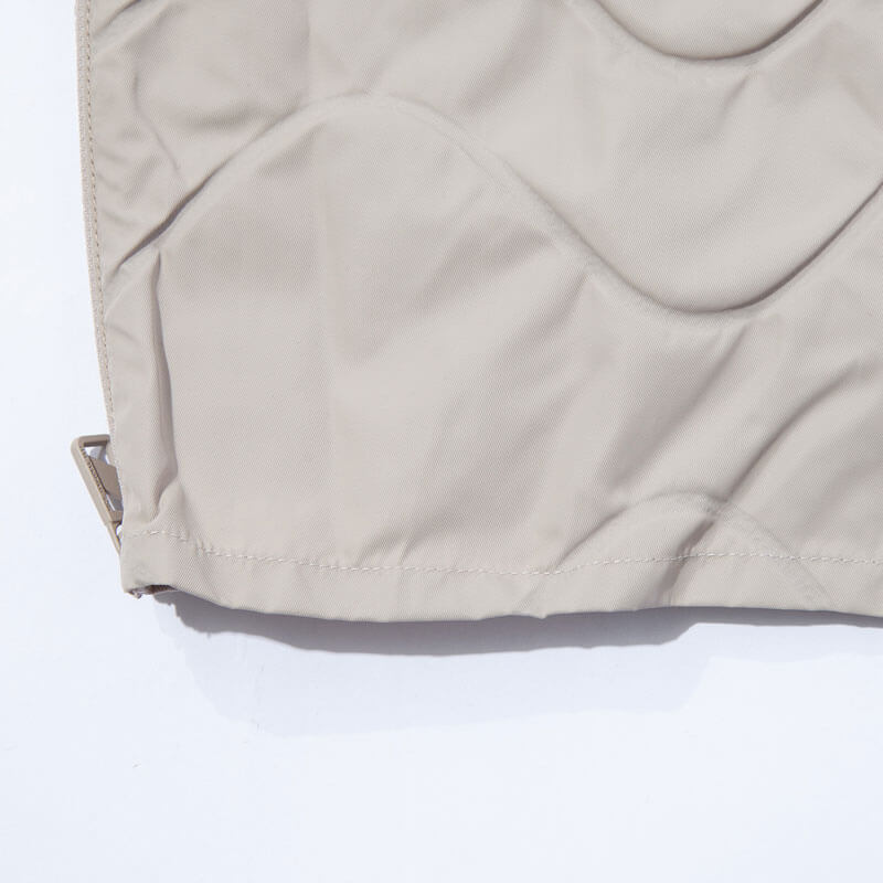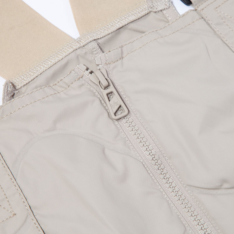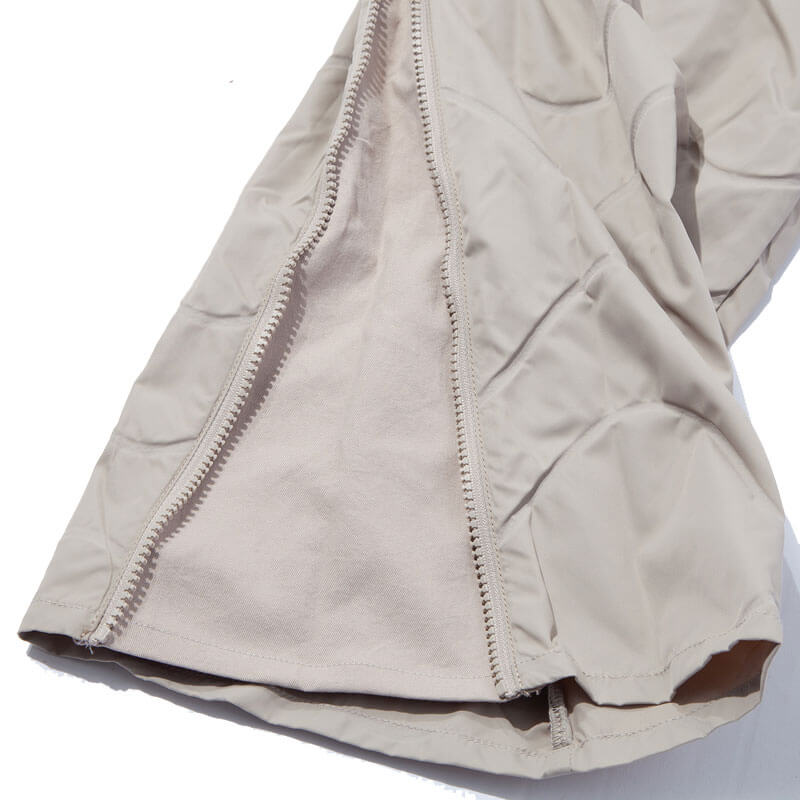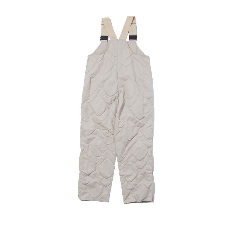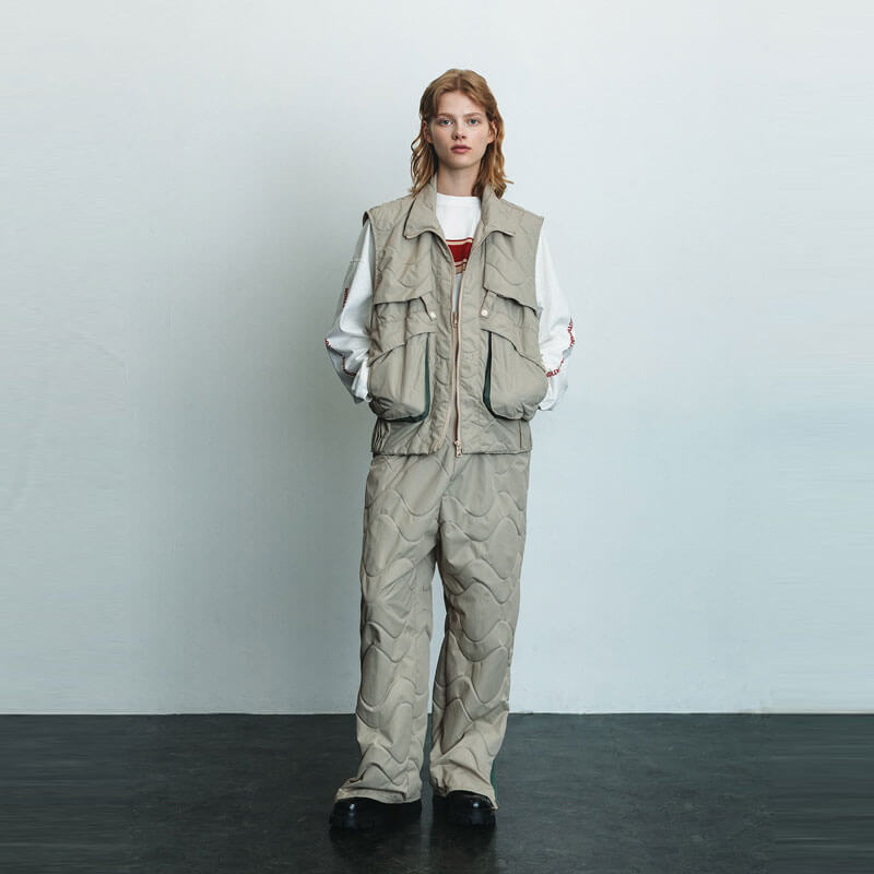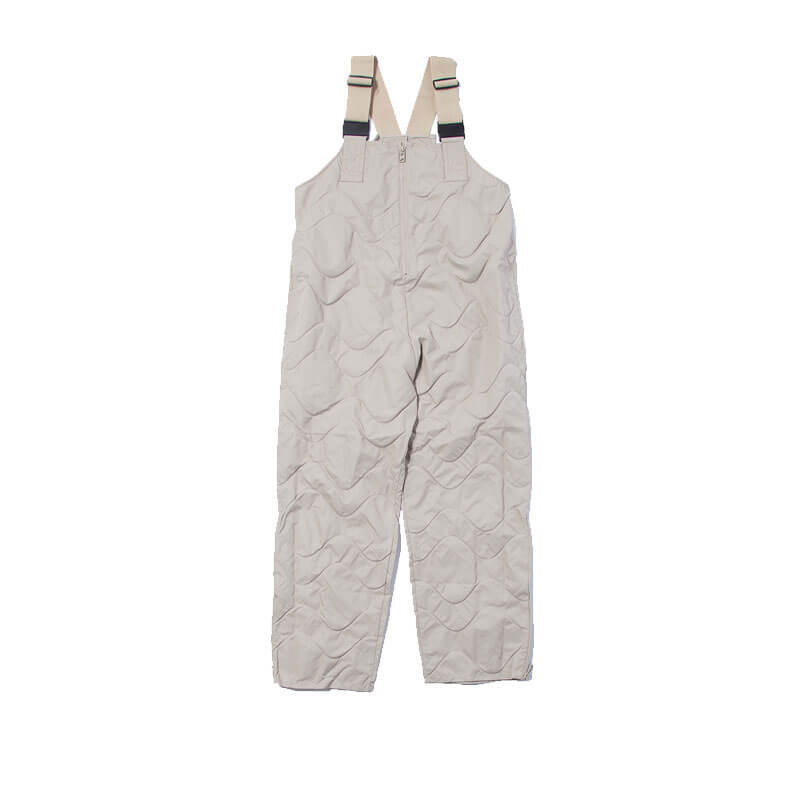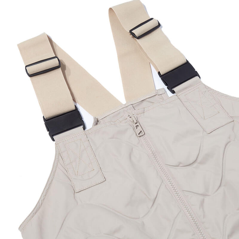 F/CE. Quilt-Like Overall – Greige: Overall made of a special fabric with a military pattern expressed by irregularities in depth, almost like embossing. The original fabric has a characteristic design with a gourd pattern that is not of a certain width and a three-dimensional effect due to the unevenness. This design is inspired by liner trousers, with thick elasticated shoulder braces which are detachable with a buckle. Featuring a semi-oversized and relaxed silhouette, included also front zipper as a design point for easy on/off and zippers at the side of the hem that allow the silhouette of the trousers to be changed.