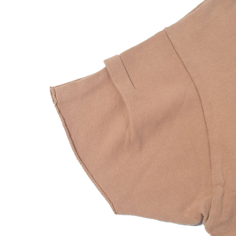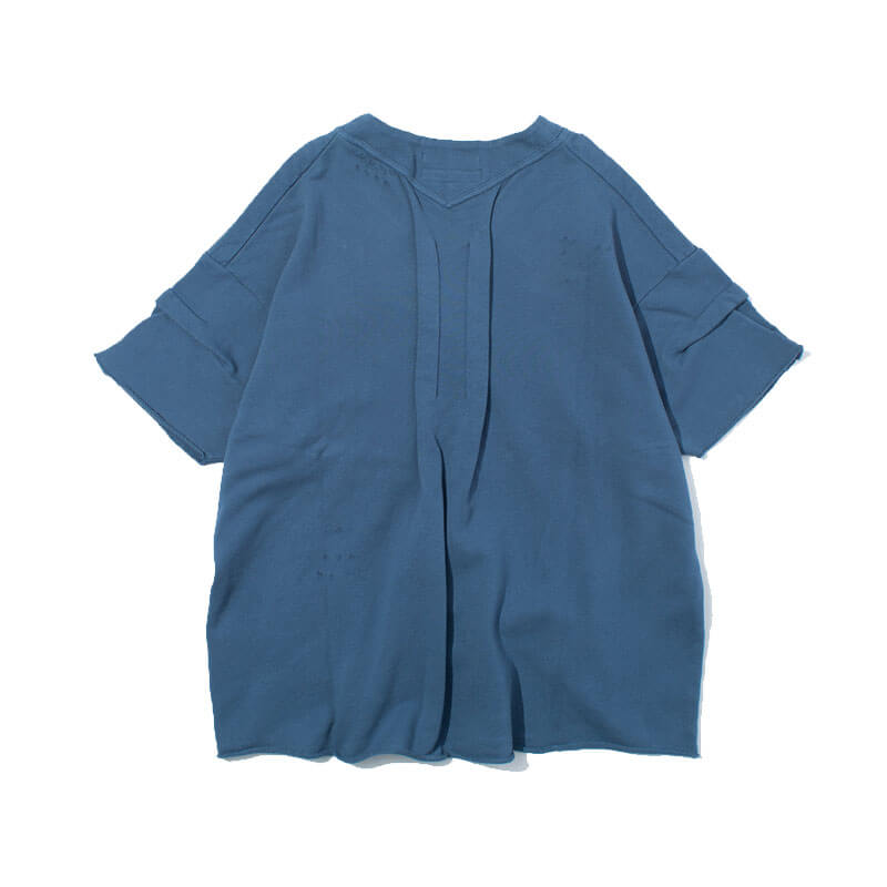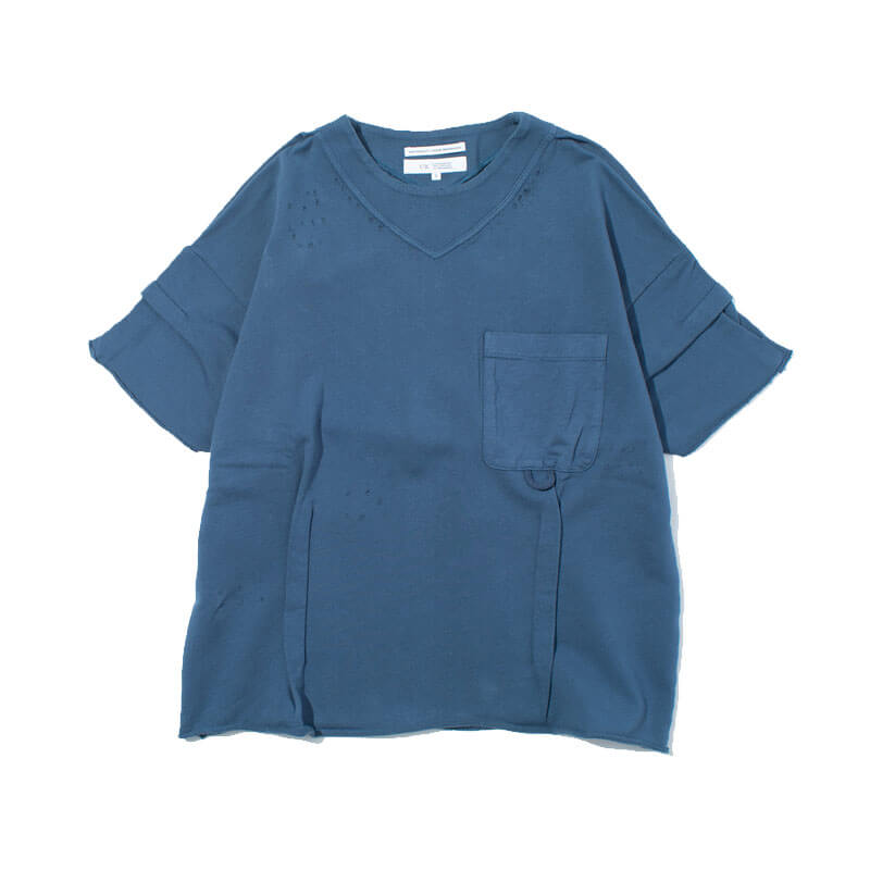 F/CE. Re French Terry Rib Tee – Blue: V-neck ribbed, sweat T-shirt produced from a recycled cotton – which is made from cut pieces from cutting clothes. Features an unique, loose-fitting silhouette and designed with the use of tucks and darts.