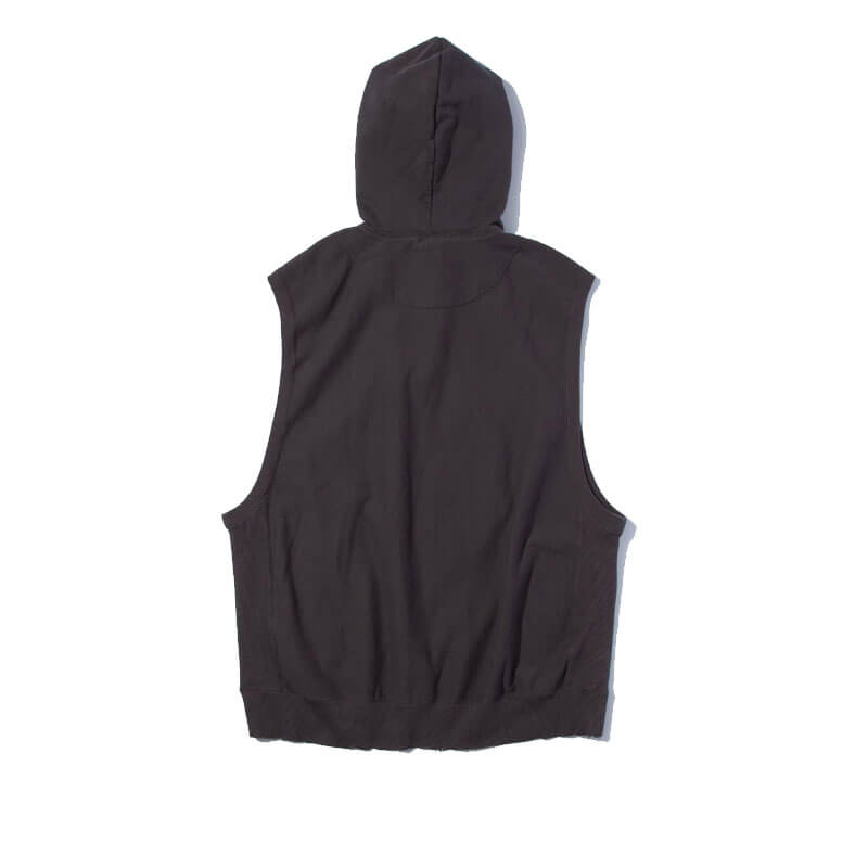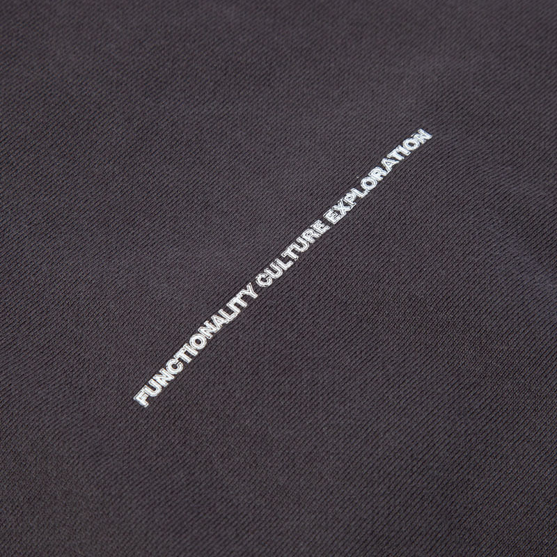 F/CE. Re Sweat Hoodie Vest – Charcoal: Thick, strong reverse-weave style big sweatshirt hoodie without sleeves made from recycled yarn. With a comfortable and oversized fit, is designed in an oversized silhouette and features a small ‘Functionality Culture Exploration’ print on the front middle section. A washed and worn finishing complete the design for a vintage feeling.