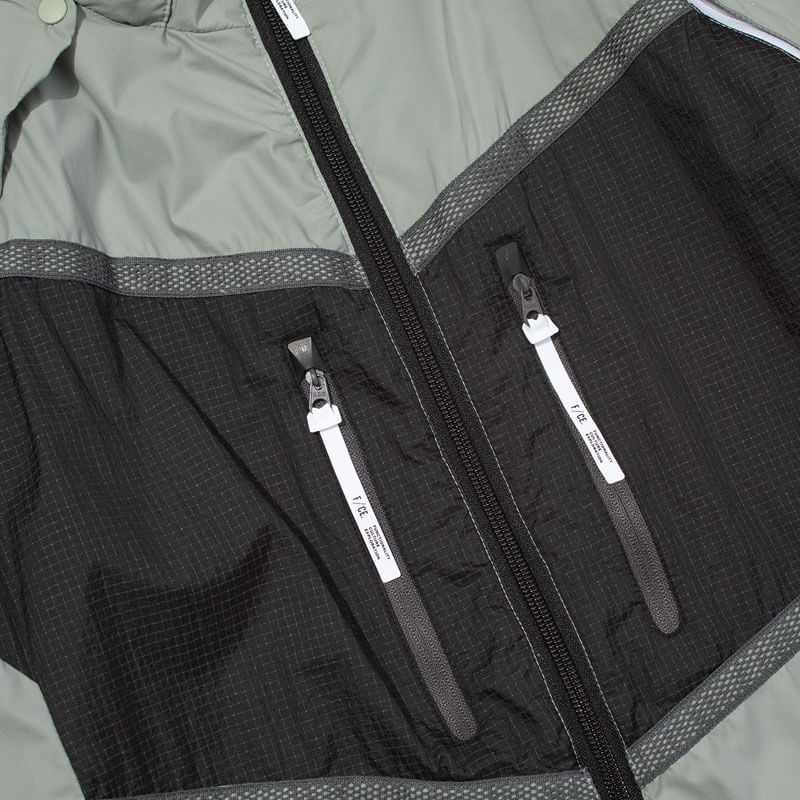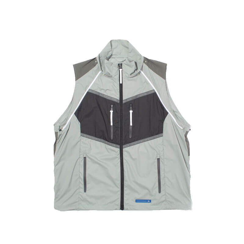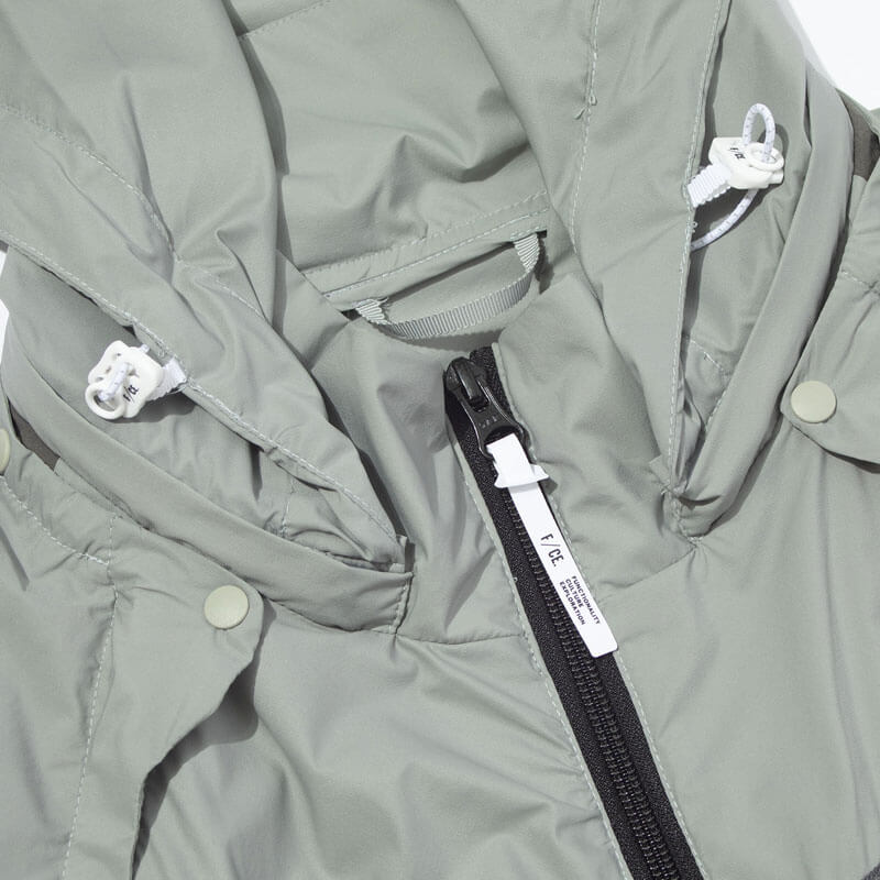 F/CE. Stowable Transform Jacket – Gray: Transformable jacket crafted from ultra-water-repellent lightweight nylon and features a packable design, allowing it to be stored in its own back outer pocket. Featuring detachable sleeves that convert the jacket into a vest and removable hood for added versatility. The transformable structure makes this jacket suitable for various climates and offers a range of styling options, focusing on convenience and usability.