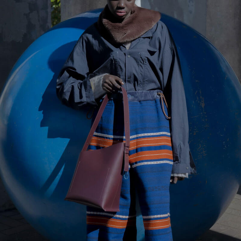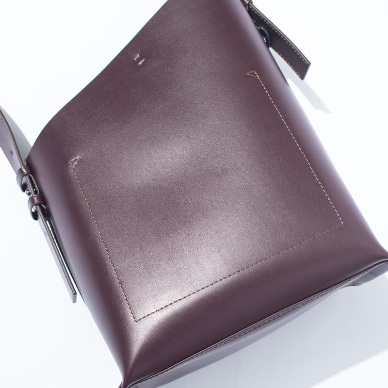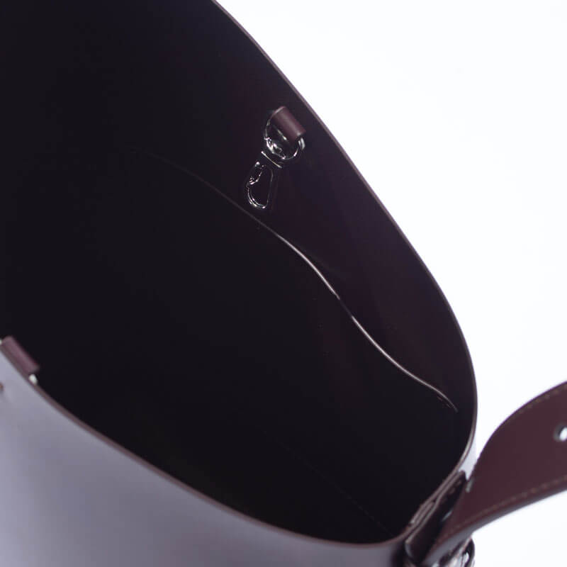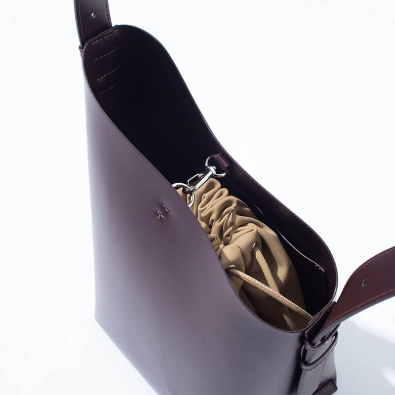 F/CE. Tech Leather Diagonal Cut Bag – Wine: Bucket-shaped mini shoulder bag in 100% animal-free Ecotech leather. This Ecotech Leather material is a hybrid material that is lightweight, stain-resistant and characterized by its modern look.