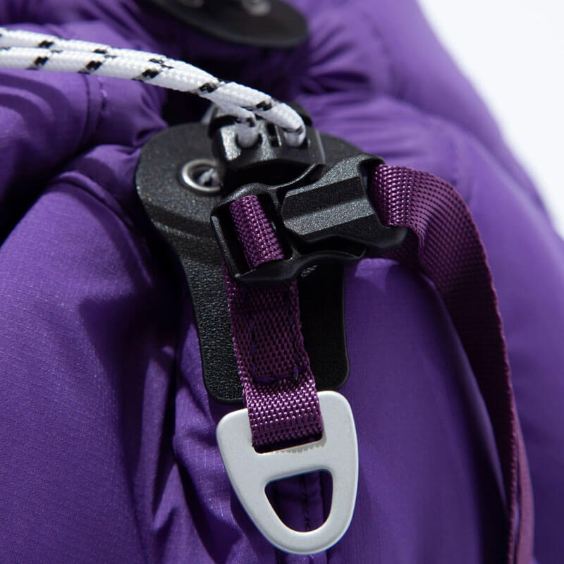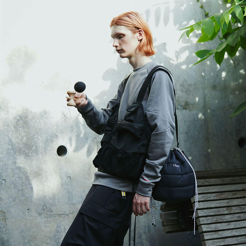 F/CE. W.R Padding Drawstring Bag – Black: A lightweight drawstring shoulder bag made of 20D nylon lip material with a water-repellent finish and padded.