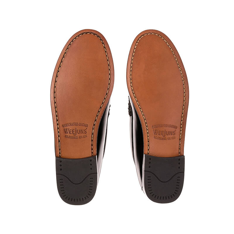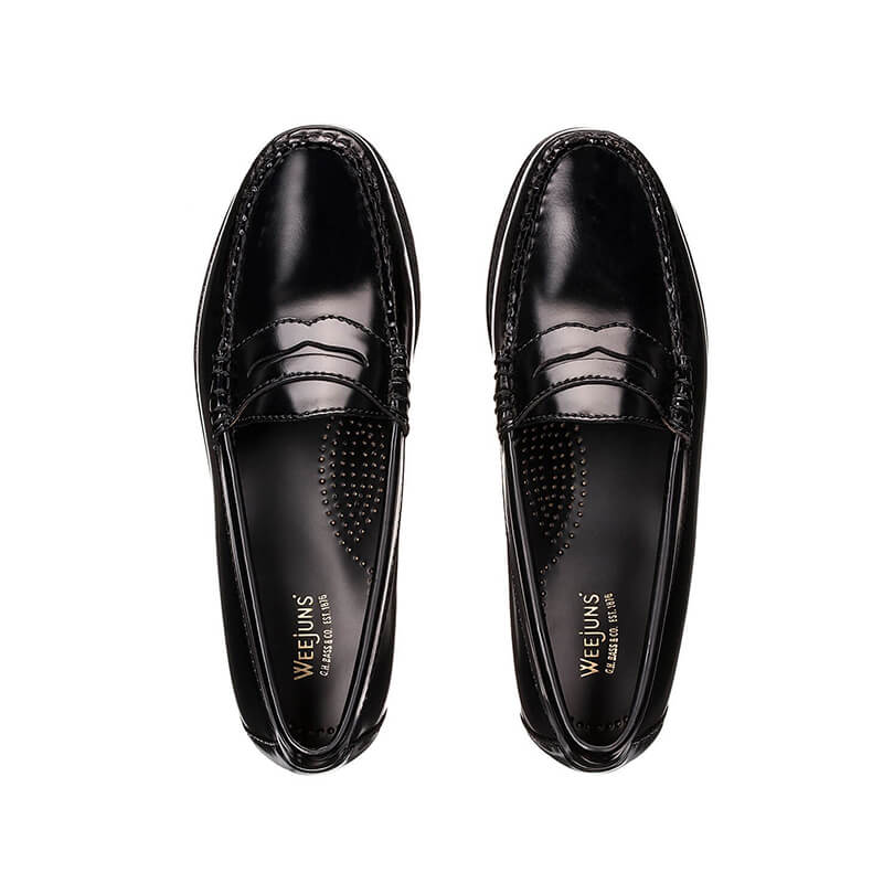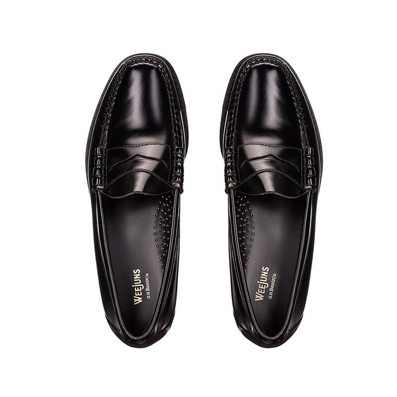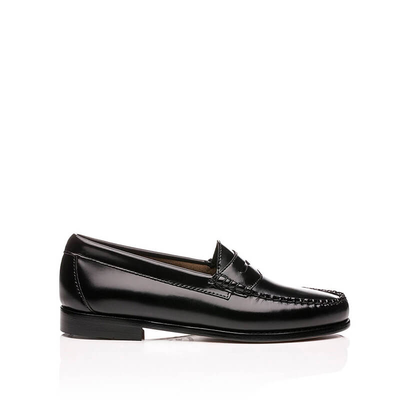 G.H.BASS Weejuns Larson Moc Penny Loafers – Black: Classic penny loafer in black polished leather. Carefully hand stitched in tonal waxed thread by master craftsmen, the beautiful Weejuns Larson is the original slip on penny loafer. After almost 80 years, its classic design and lightweight, comfortable, flexible construction are still today’s winners