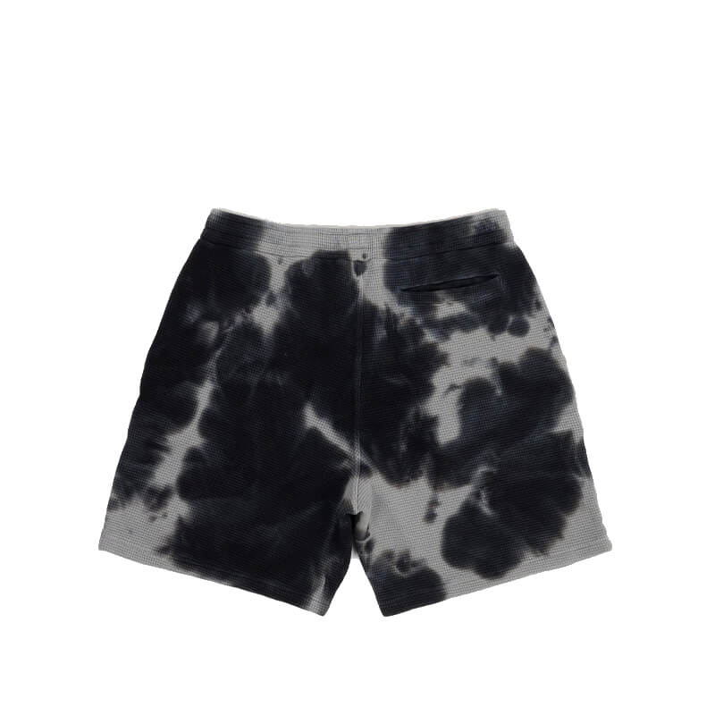 GOOD MORNING TAPES Waffle Shorts – Smoke Tie Dye: Short pants crafted in heavy waffle cotton jersey with all-over hand tie-dye finishing. Featuring elasticated waist, side & back pockets with drawstring tie closure. Included in the last FW23 delivery, these GOOD MORNING TAPES Waffle Shorts – Smoke Tie Dye are equipped with: